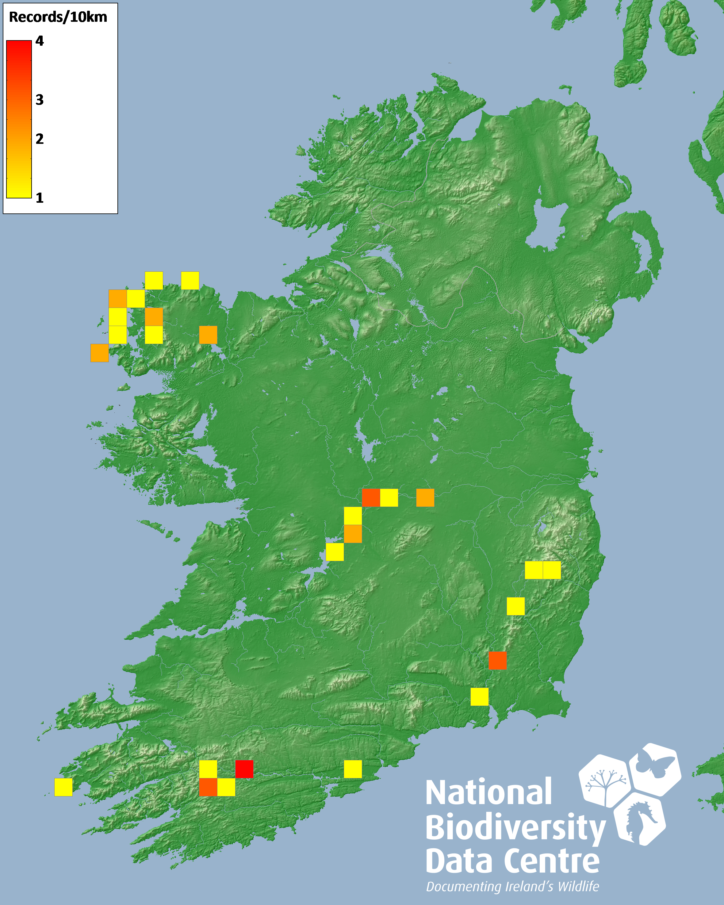 Distribution of the number of records recorded within each 10km grid square (ITM).Marine Map - 50km