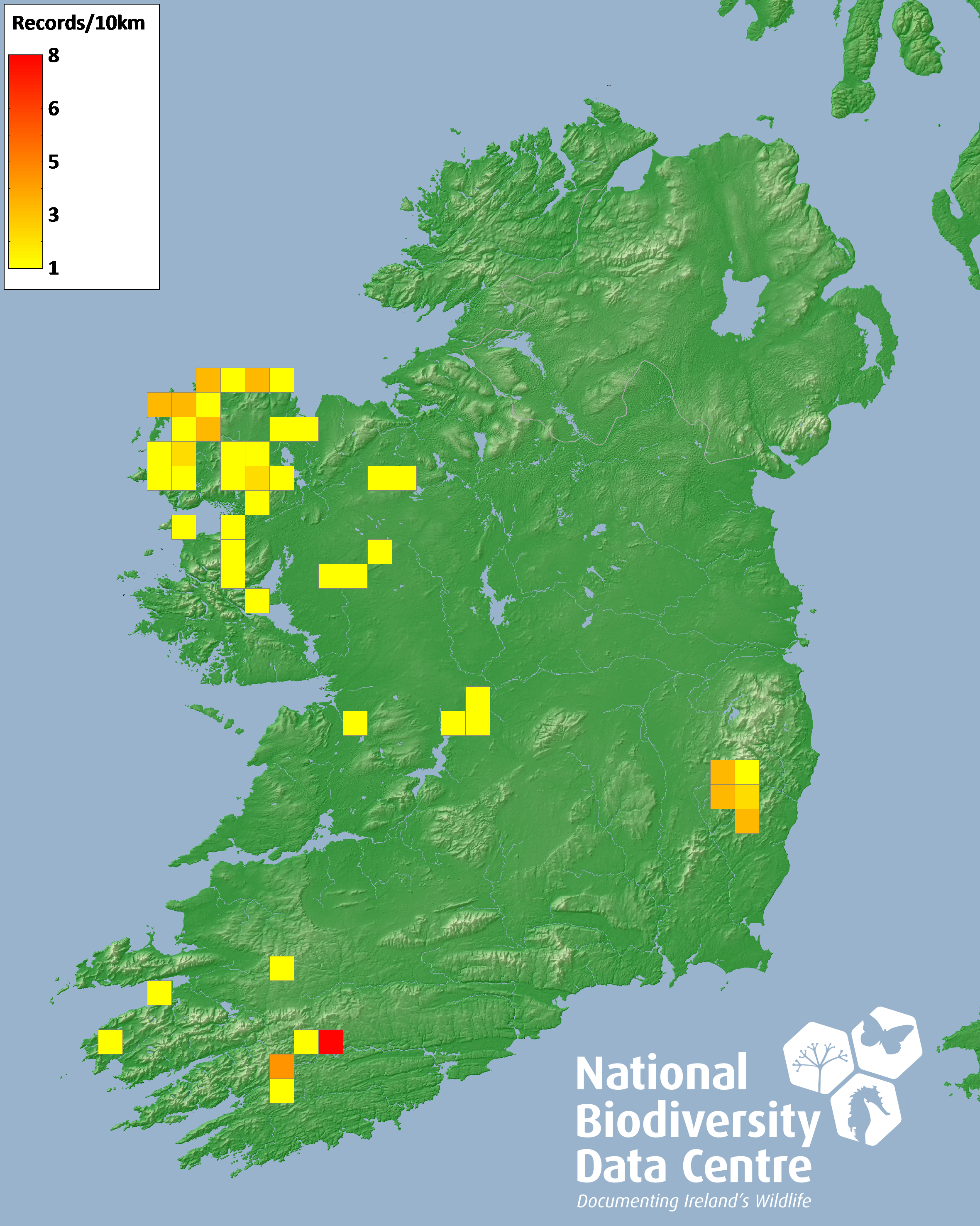 Distribution of the number of records recorded within each 10km grid square (ITM).Marine Map - 50km