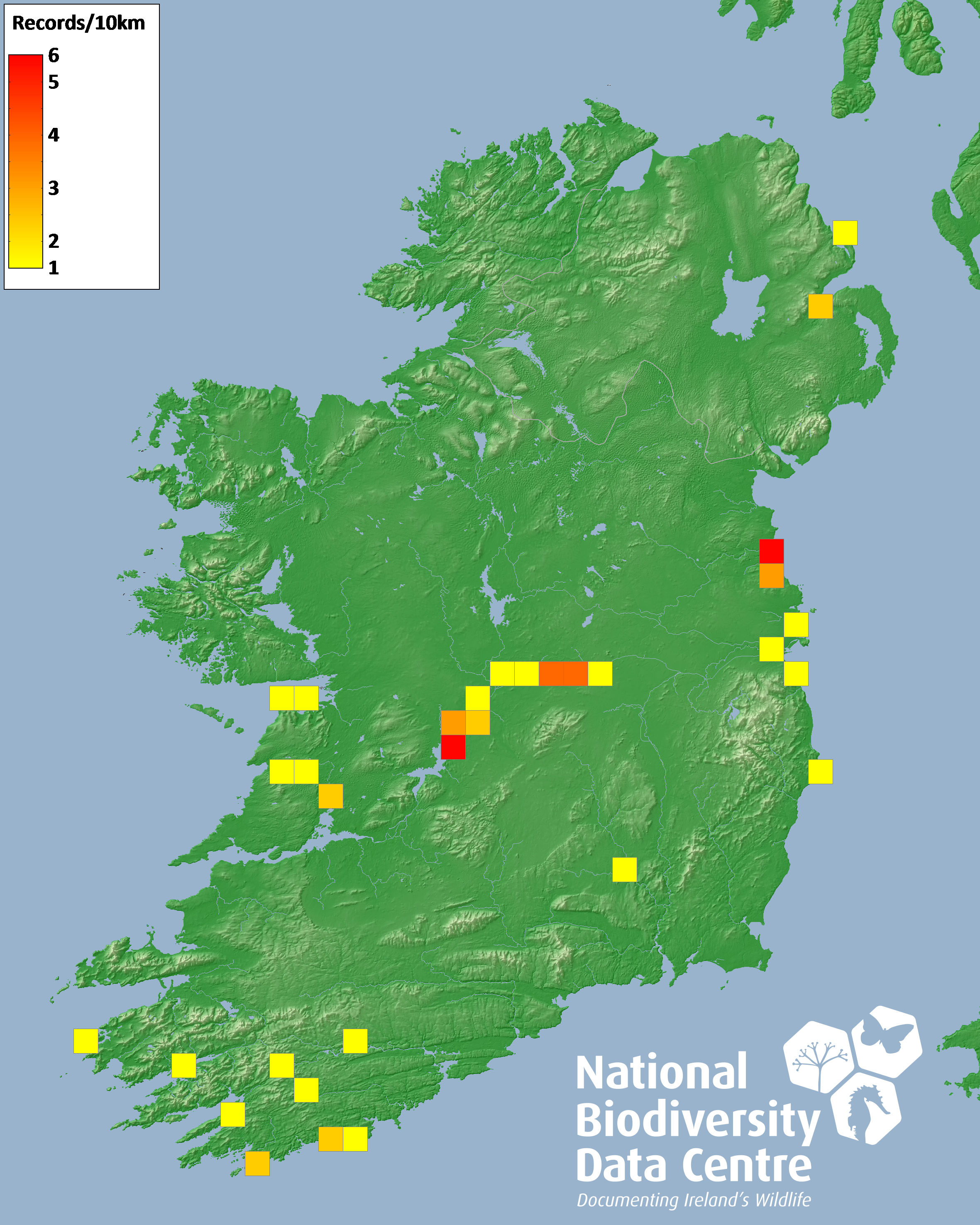 Distribution of the number of records recorded within each 10km grid square (ITM).Marine Map - 50km