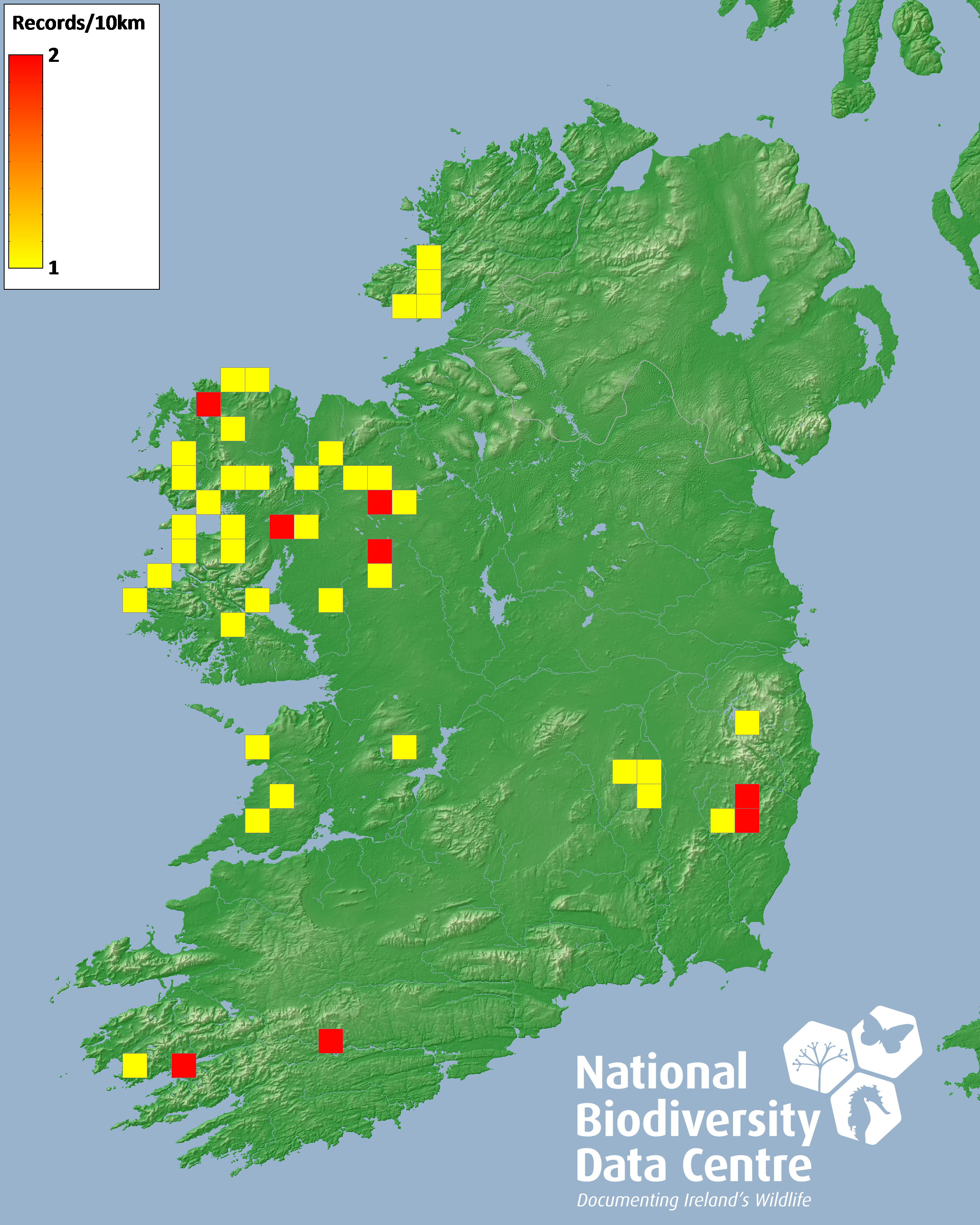 Distribution of the number of records recorded within each 10km grid square (ITM).Marine Map - 50km