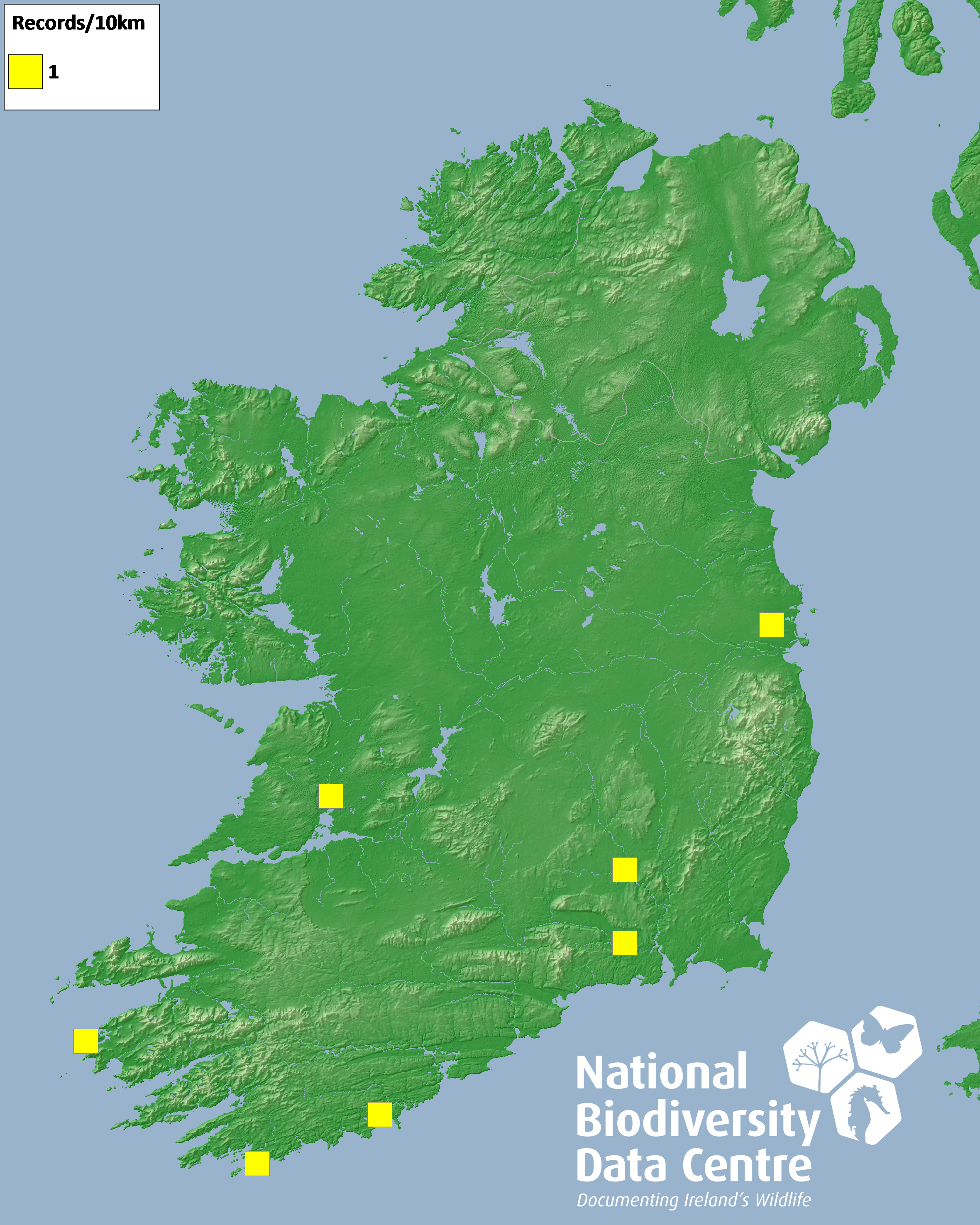 Distribution of the number of records recorded within each 10km grid square (ITM).Marine Map - 50km