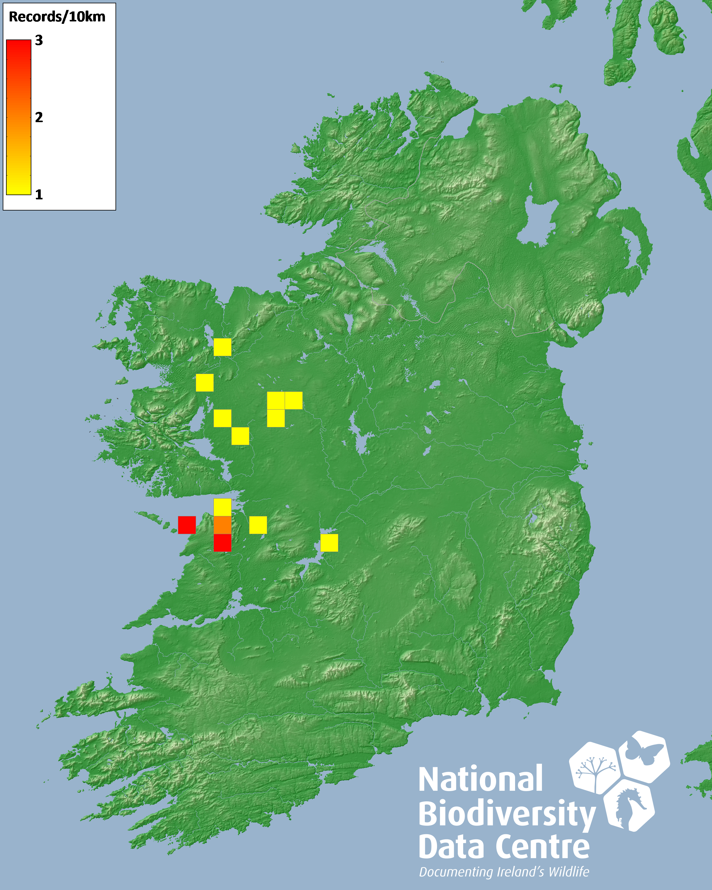 Distribution of the number of records recorded within each 10km grid square (ITM).Marine Map - 50km