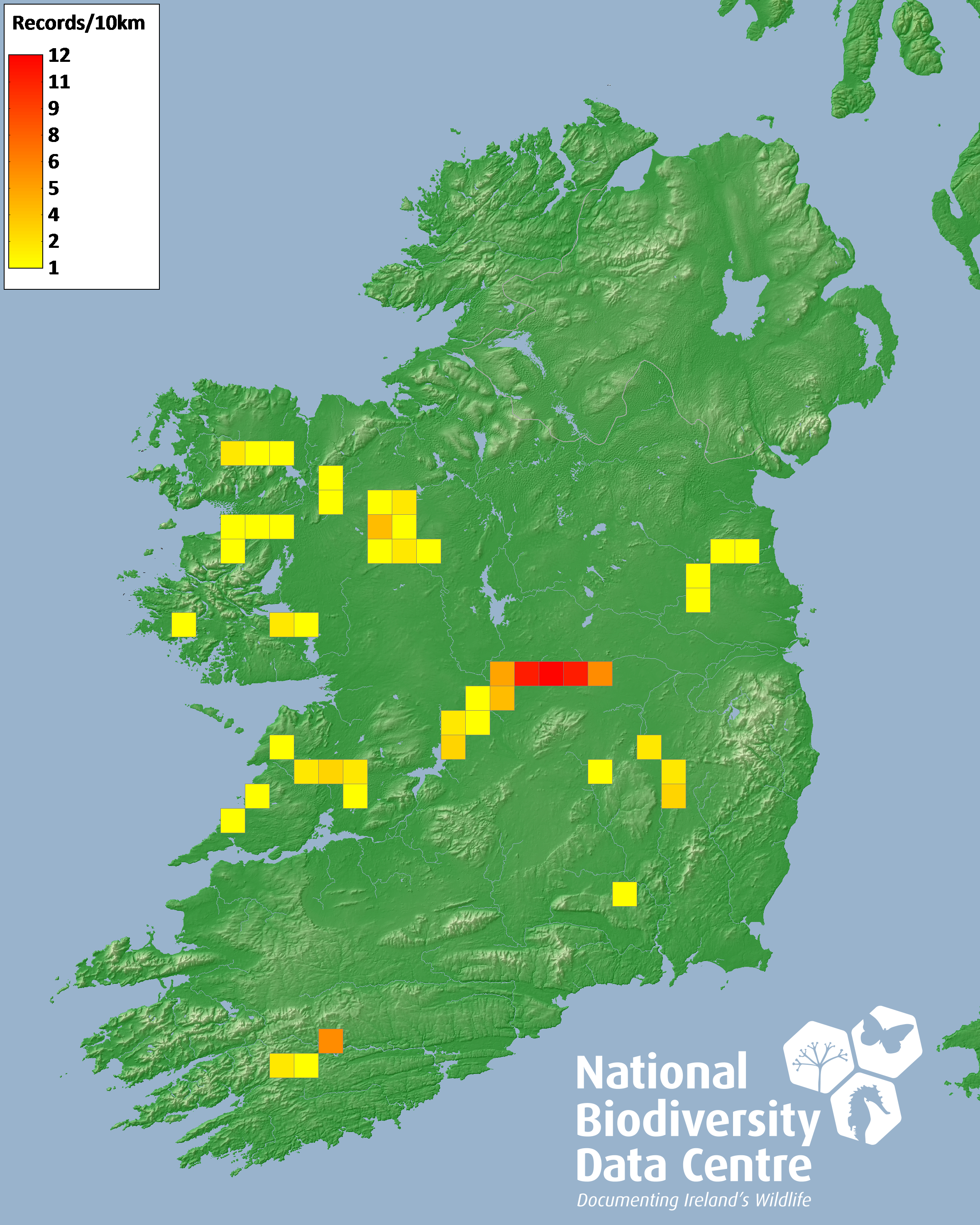 Distribution of the number of records recorded within each 10km grid square (ITM).Marine Map - 50km