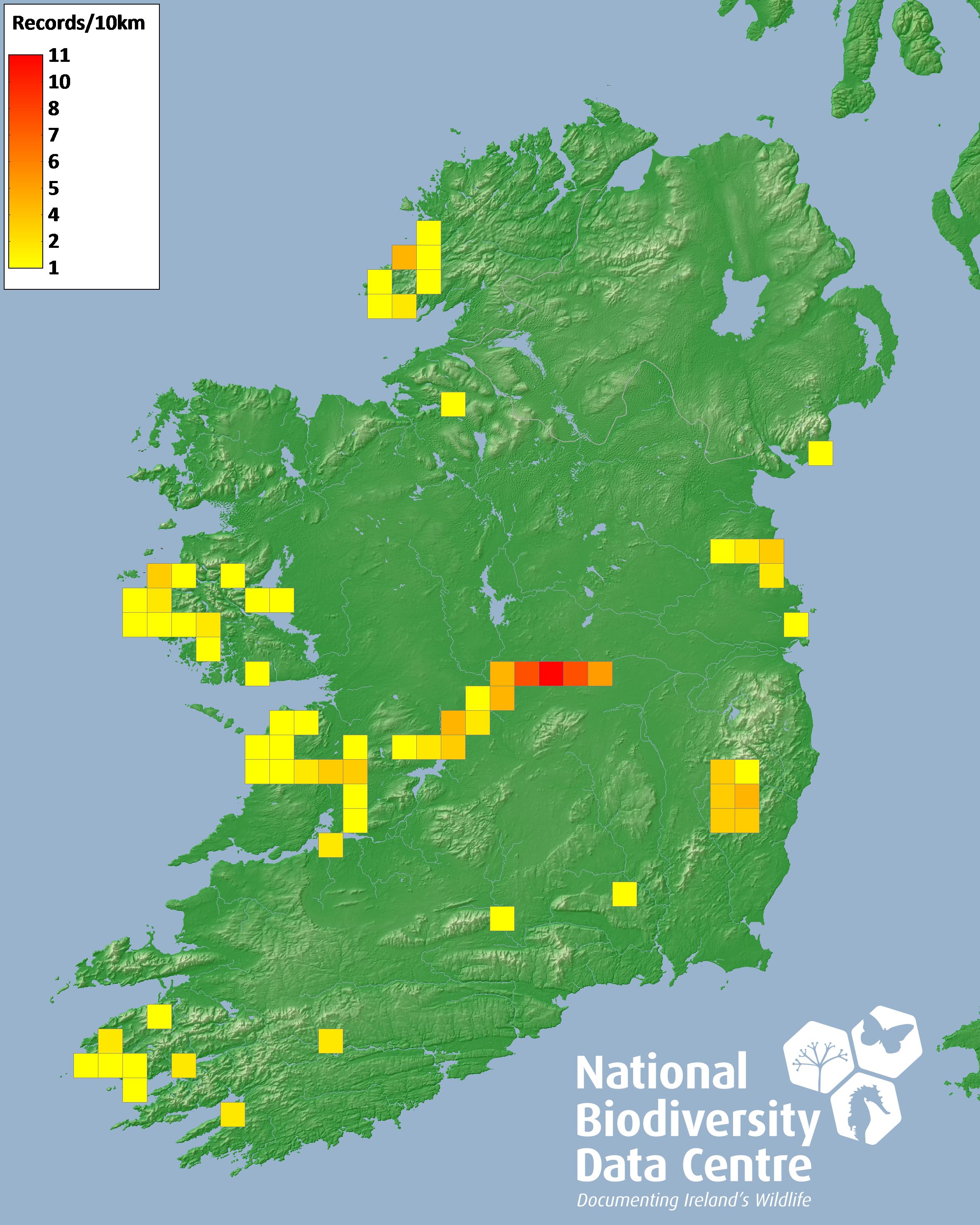 Distribution of the number of records recorded within each 10km grid square (ITM).Marine Map - 50km