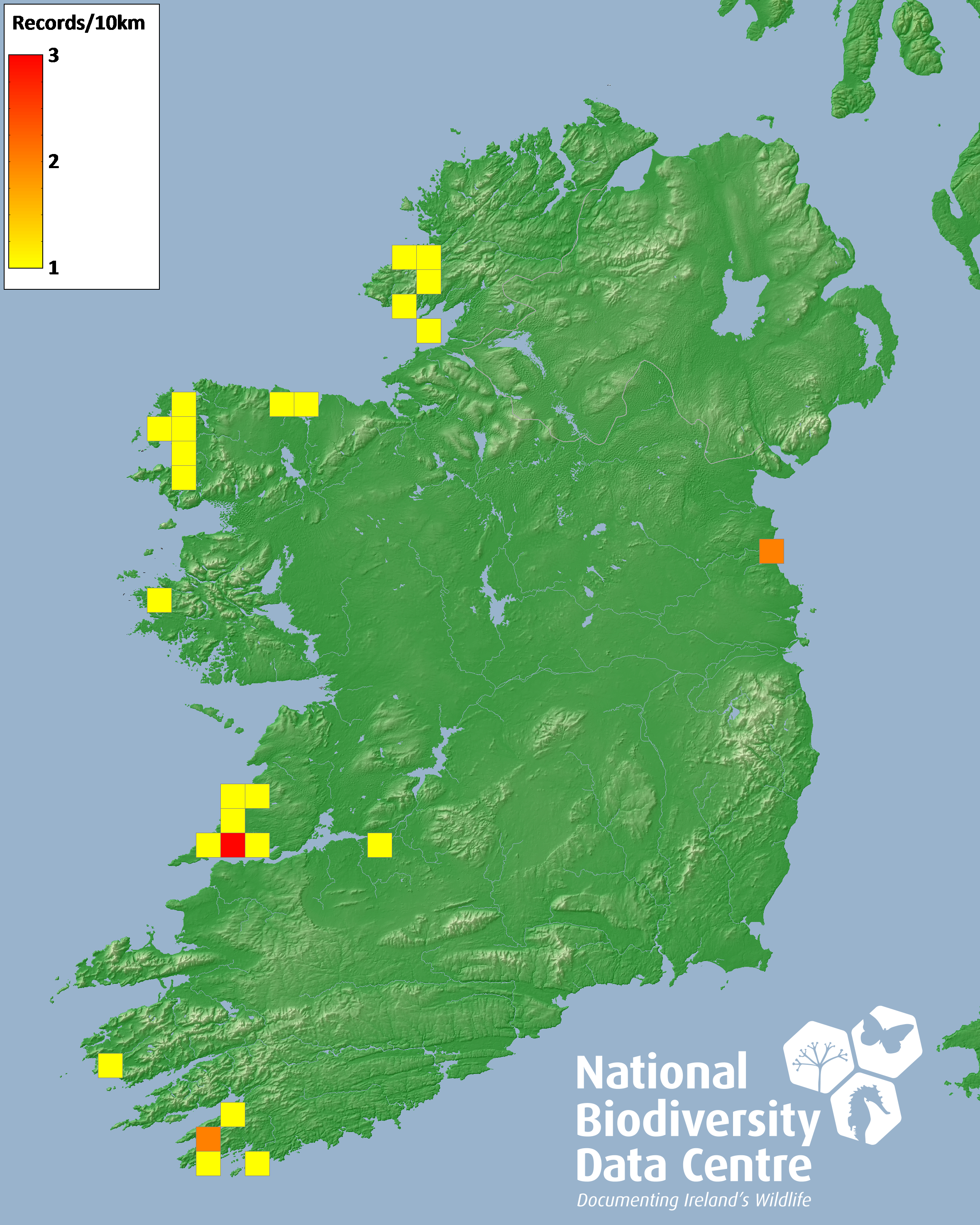 Distribution of the number of records recorded within each 10km grid square (ITM).Marine Map - 50km