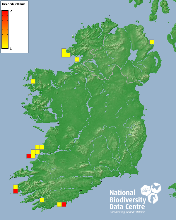 Distribution of the number of records recorded within each 10km grid square (ITM).Marine Map - 50km