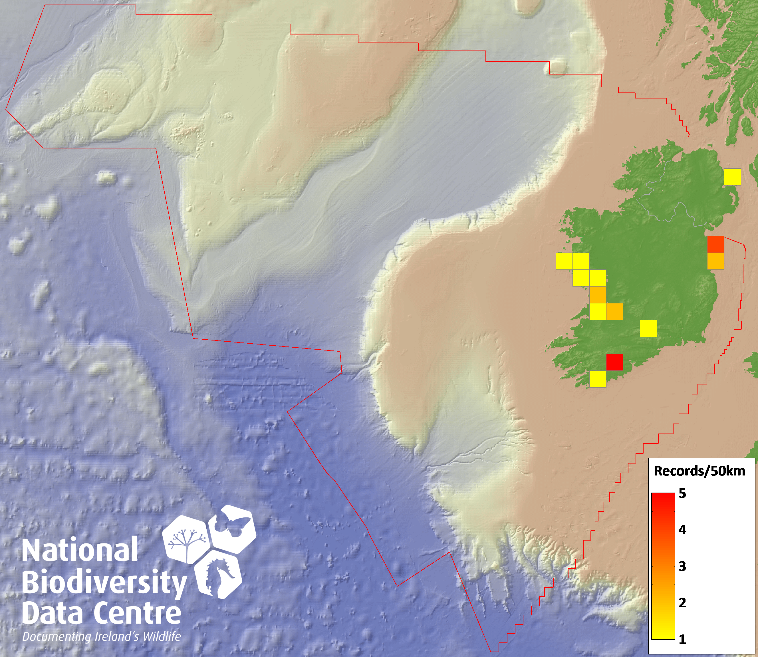 Distribution of the number of records recorded within each 10km grid square (ITM).Marine Map - 50km
