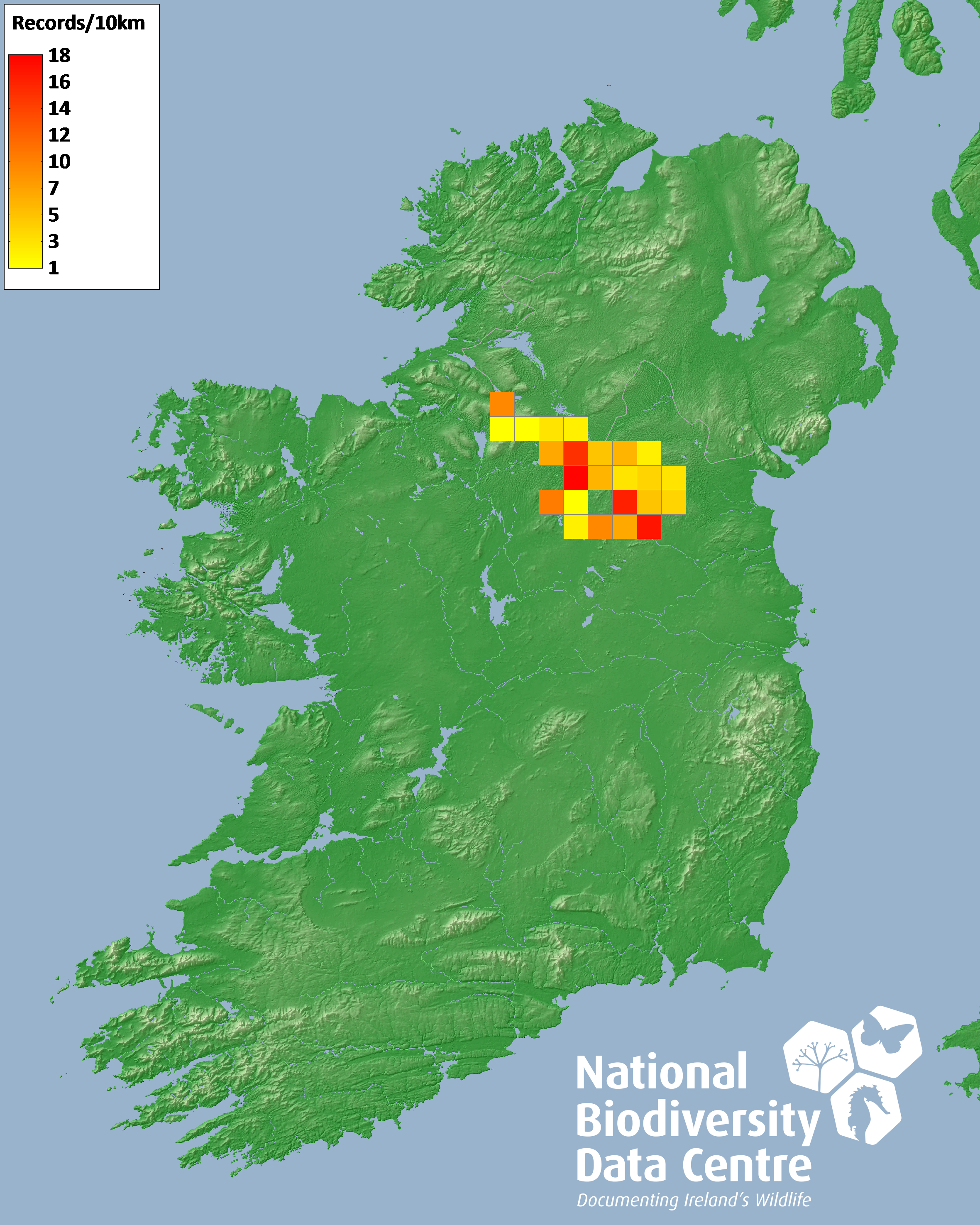 Distribution of the number of records recorded within each 10km grid square (ITM).Marine Map - 50km
