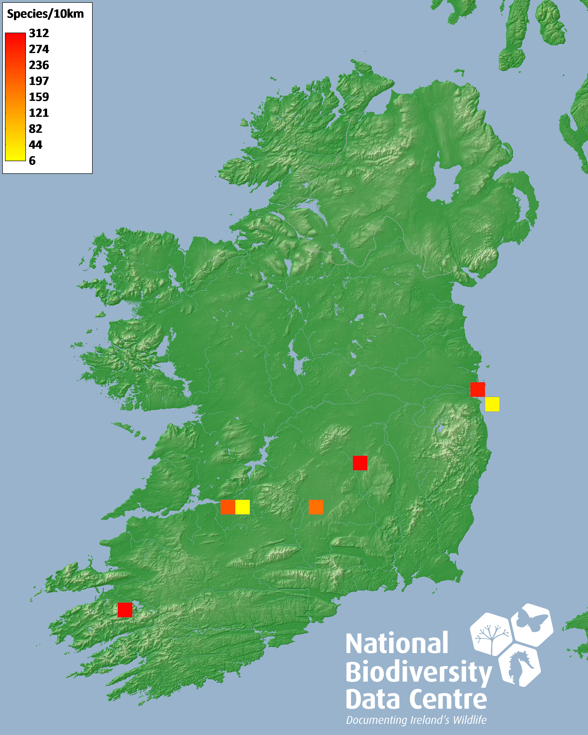 Distribution of the number of species recorded within each 10km grid square (ITM).Marine Map - 50Km