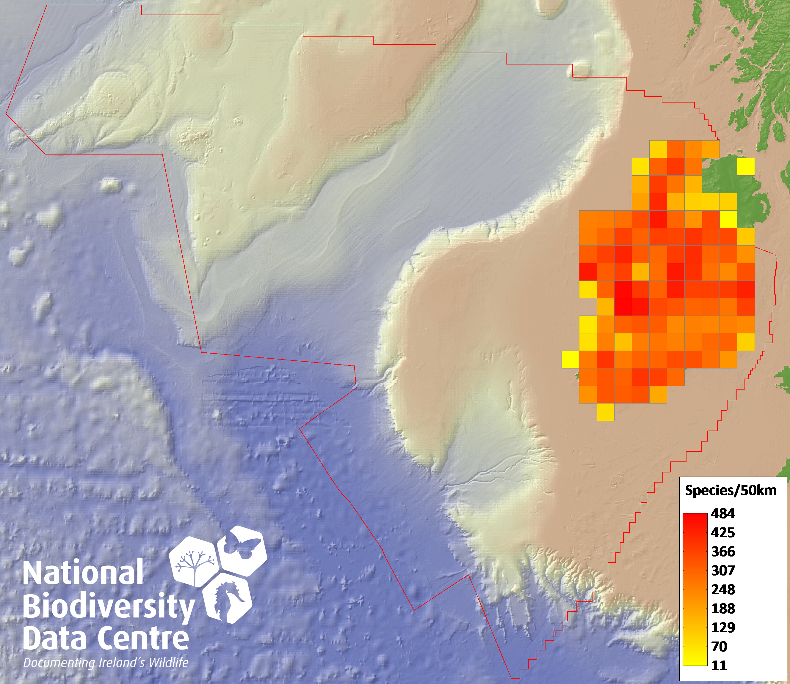 Distribution of the number of species recorded within each 10km grid square (ITM).Marine Map - 50Km