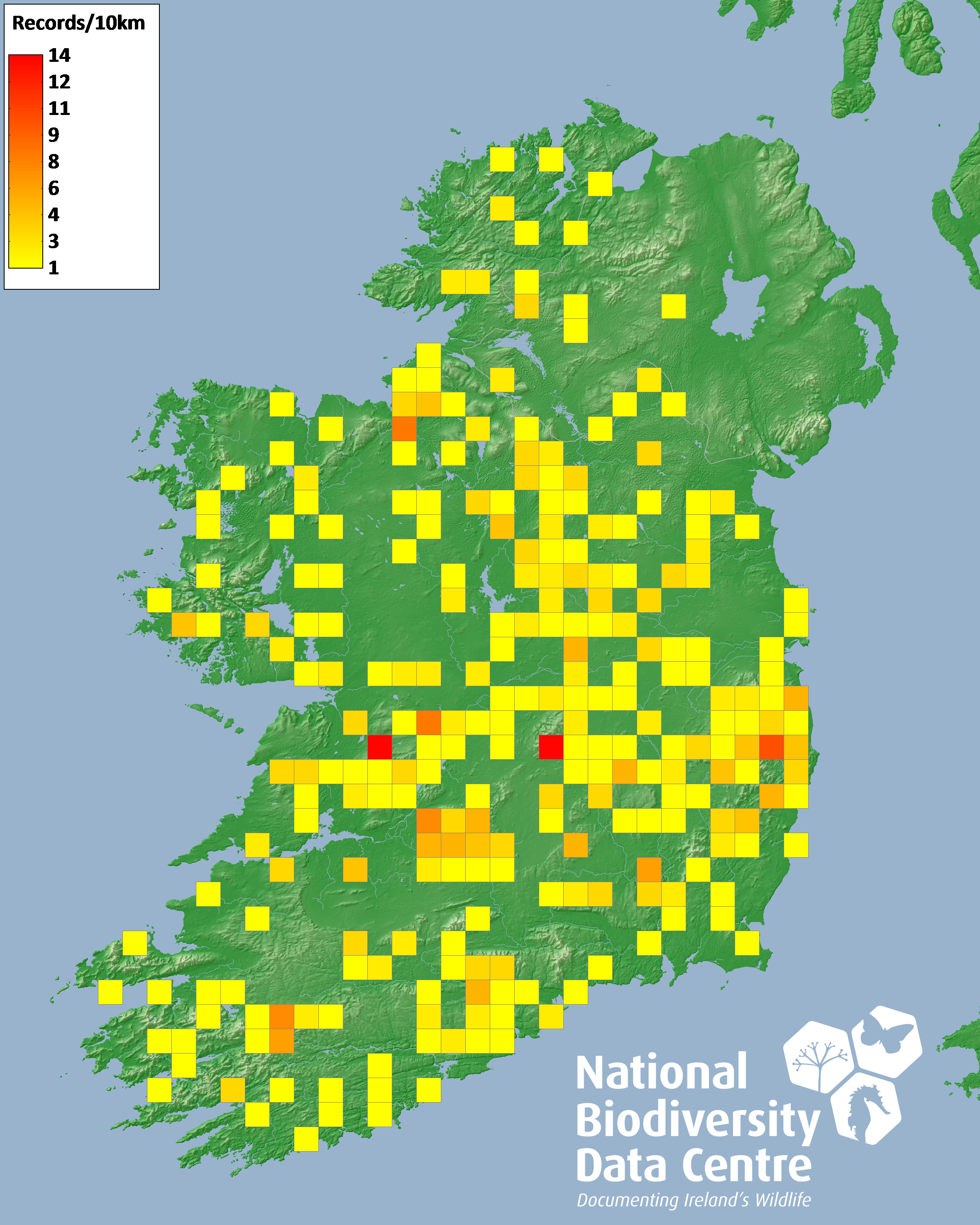 Distribution of the number of records recorded within each 10km grid square (ITM).Marine Map - 50km