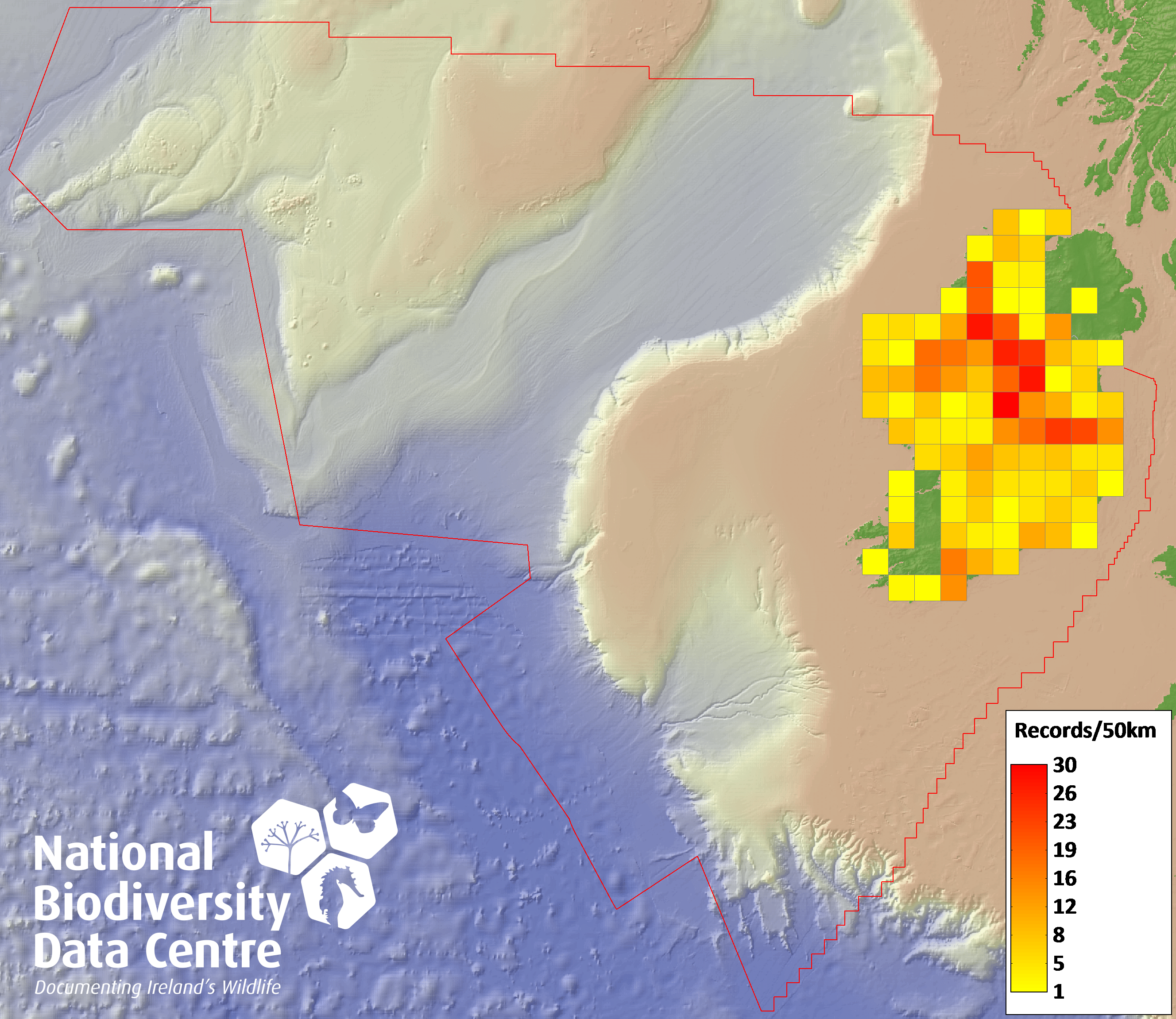 Distribution of the number of records recorded within each 10km grid square (ITM).Marine Map - 50km