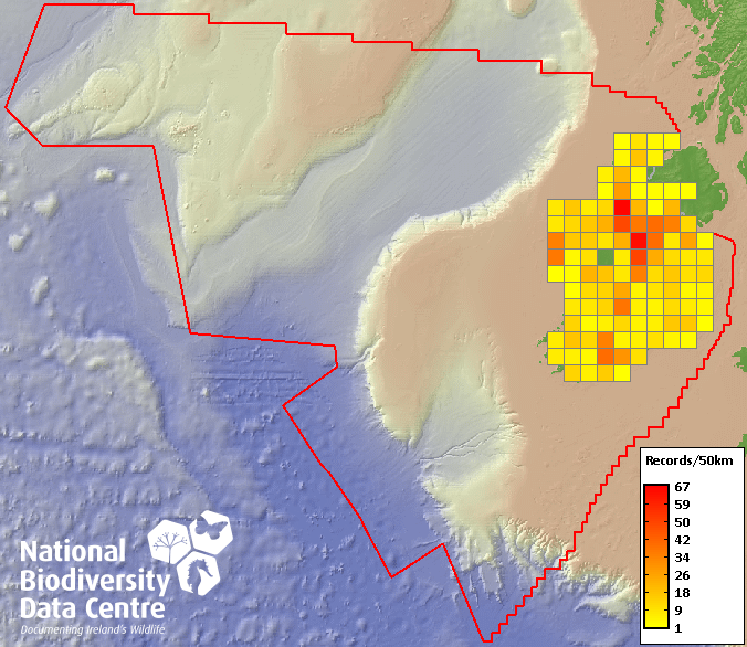 Distribution of the number of records recorded within each 10km grid square (ITM).Marine Map - 50km