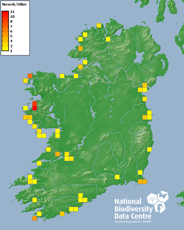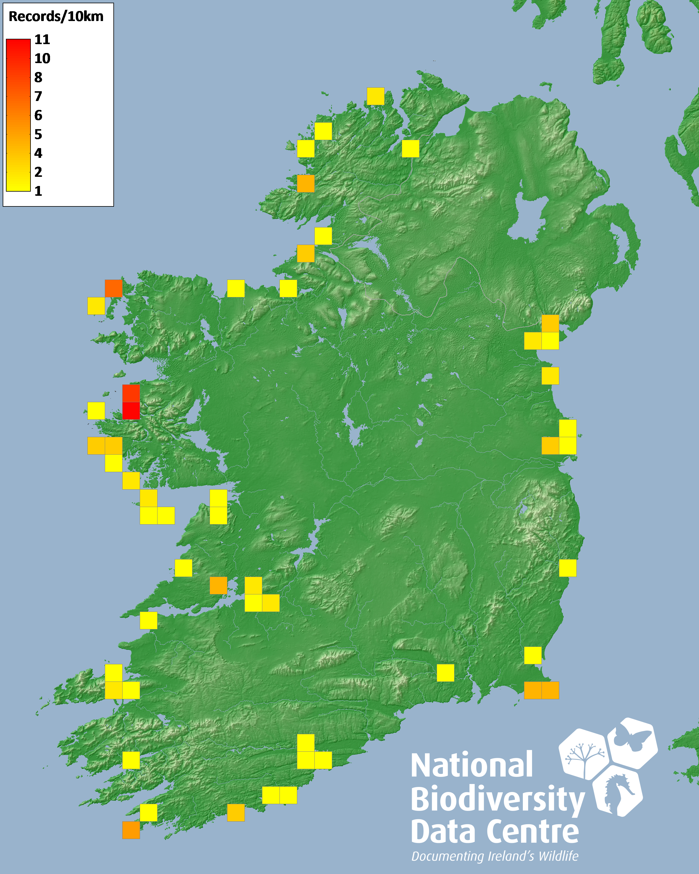 Distribution of the number of records recorded within each 10km grid square (ITM).Marine Map - 50km