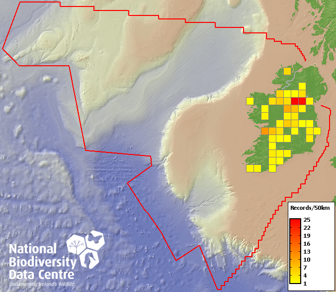 Distribution of the number of records recorded within each 10km grid square (ITM).Marine Map - 50km