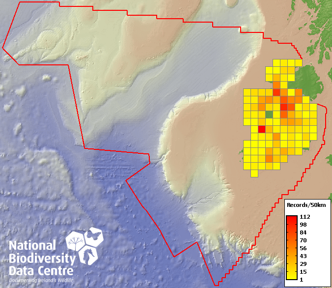 Distribution of the number of records recorded within each 10km grid square (ITM).Marine Map - 50km