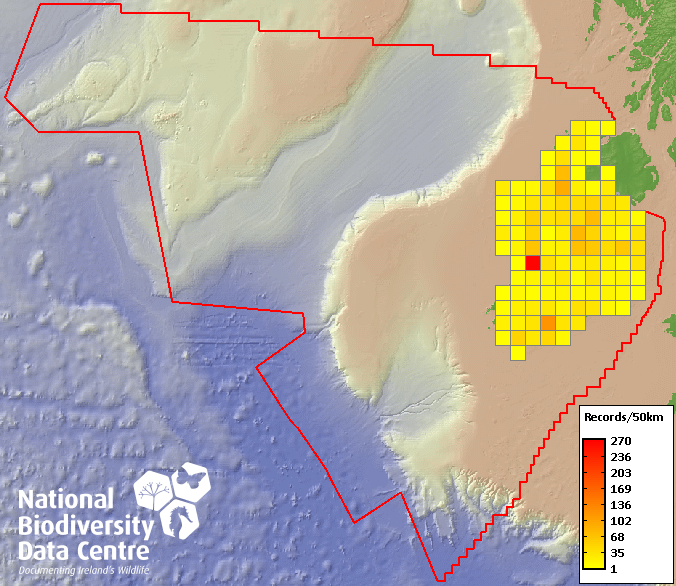 Distribution of the number of records recorded within each 10km grid square (ITM).Marine Map - 50km