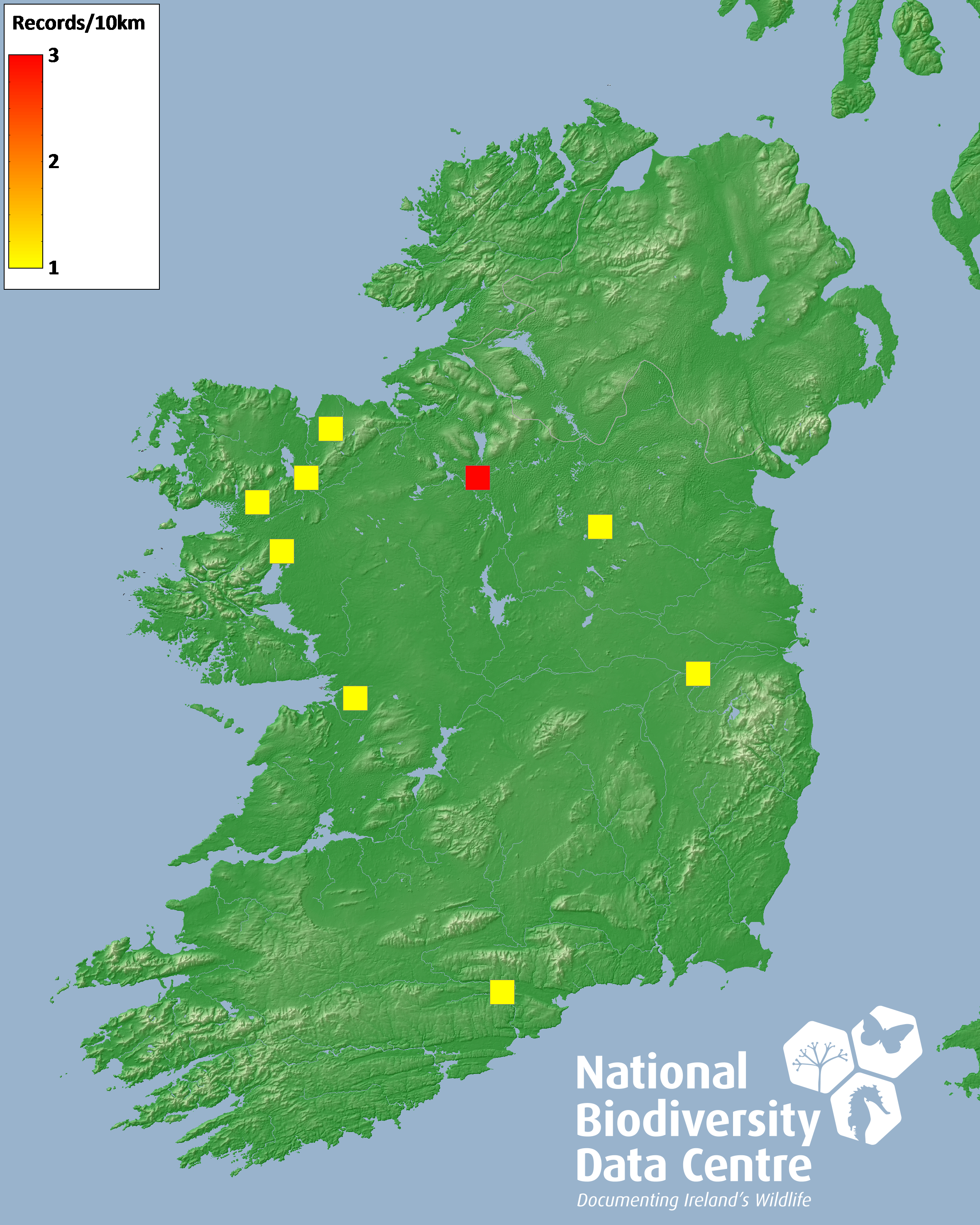 Distribution of the number of records recorded within each 10km grid square (ITM).Marine Map - 50km
