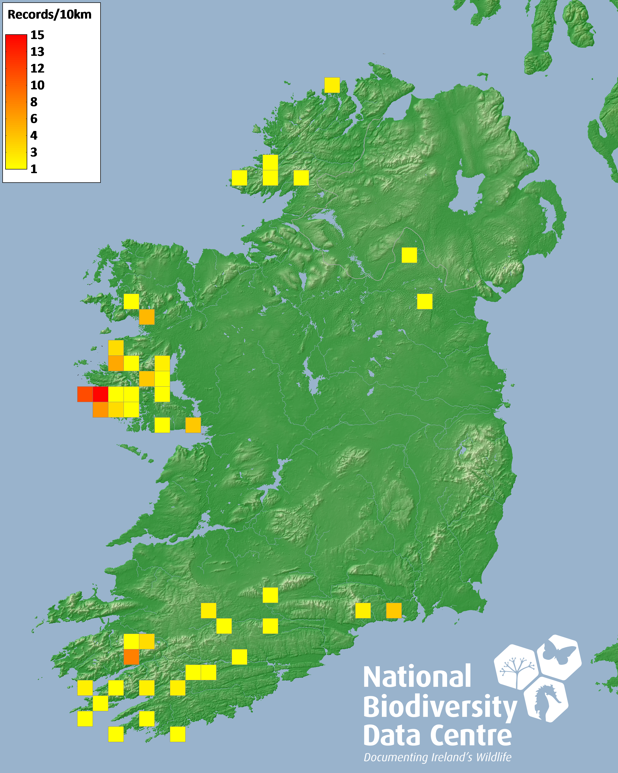 Distribution of the number of records recorded within each 10km grid square (ITM).Marine Map - 50km
