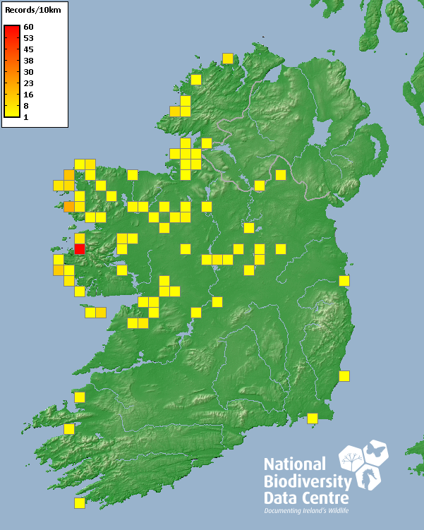 Distribution of the number of records recorded within each 10km grid square (ITM).Marine Map - 50km