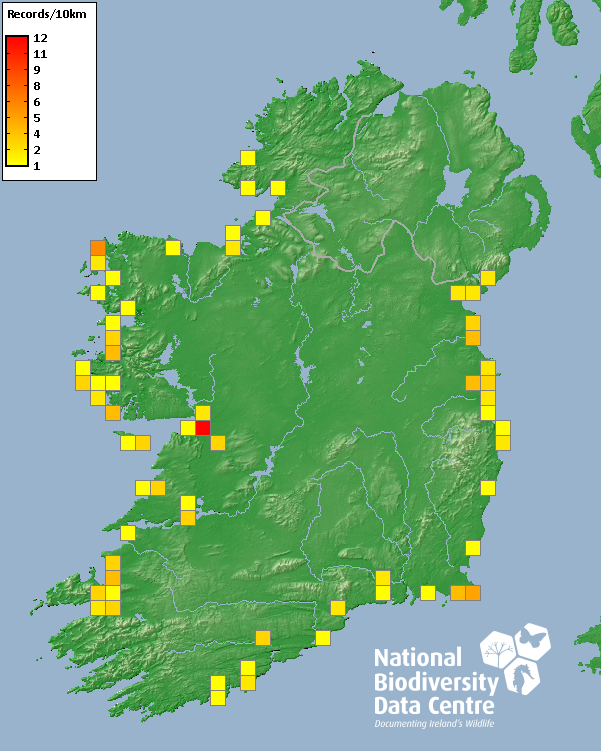 Distribution of the number of records recorded within each 10km grid square (ITM).Marine Map - 50km