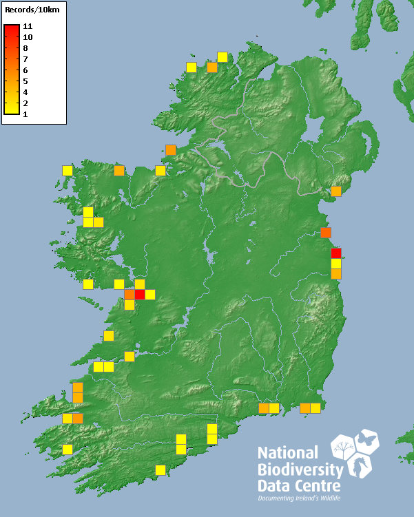 Distribution of the number of records recorded within each 10km grid square (ITM).Marine Map - 50km