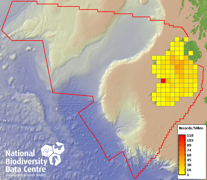 Distribution of the number of records recorded within each 10km grid square (ITM).Marine Map - 50km
