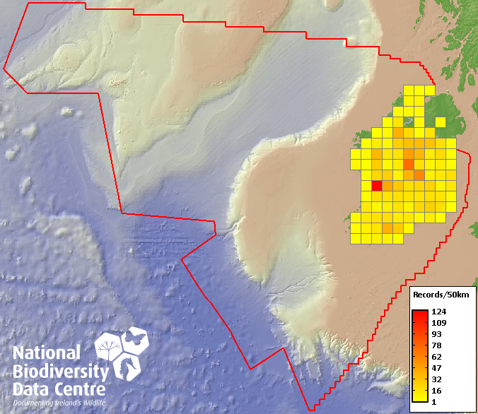 Distribution of the number of records recorded within each 10km grid square (ITM).Marine Map - 50km