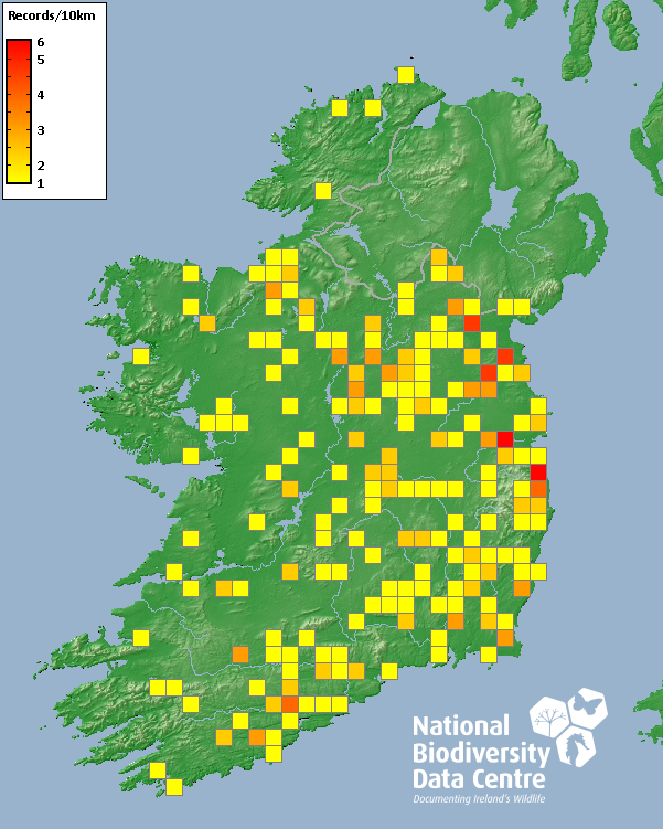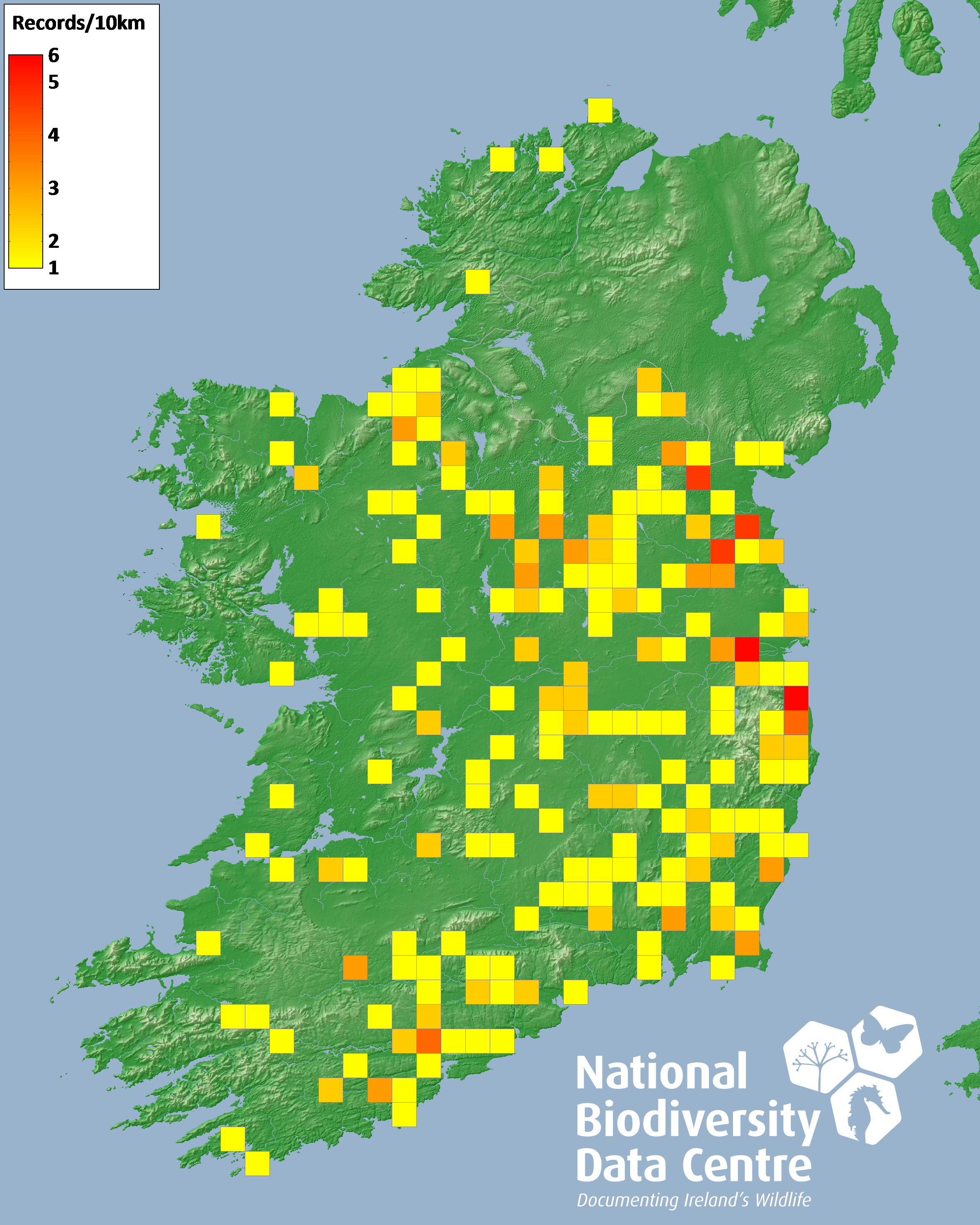 Distribution of the number of records recorded within each 10km grid square (ITM).Marine Map - 50km