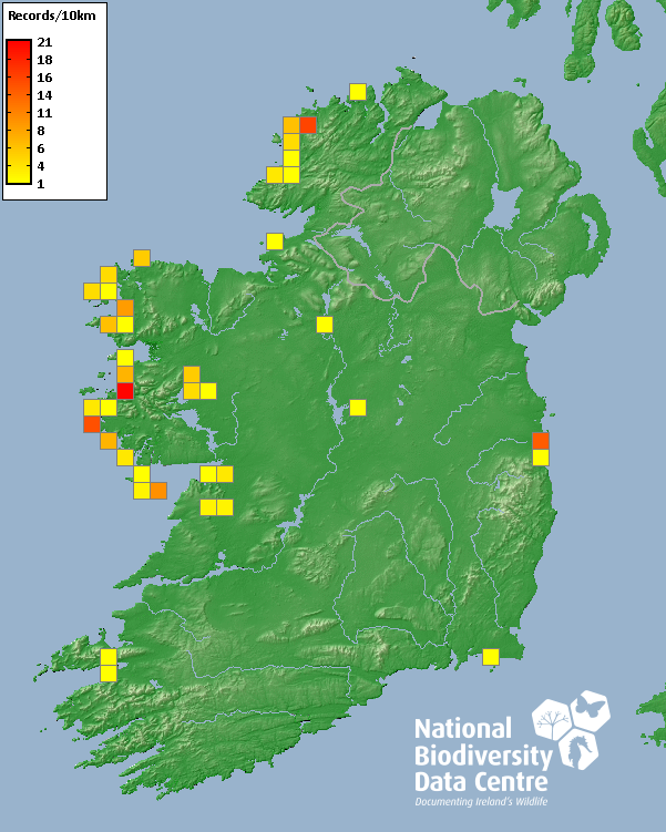 Distribution of the number of records recorded within each 10km grid square (ITM).Marine Map - 50km