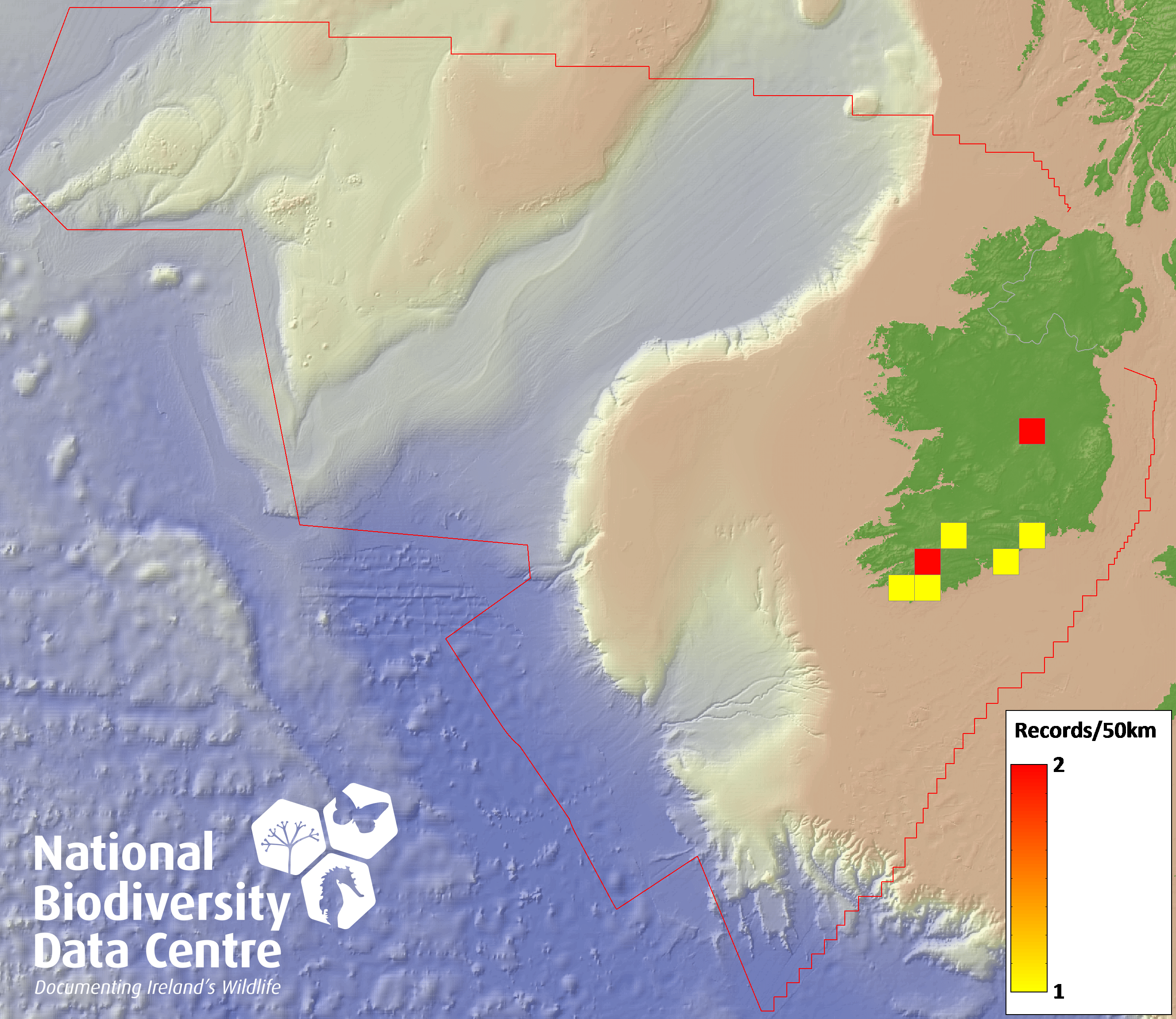 Distribution of the number of records recorded within each 10km grid square (ITM).Marine Map - 50km