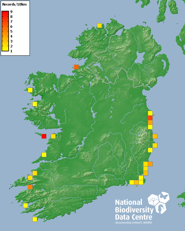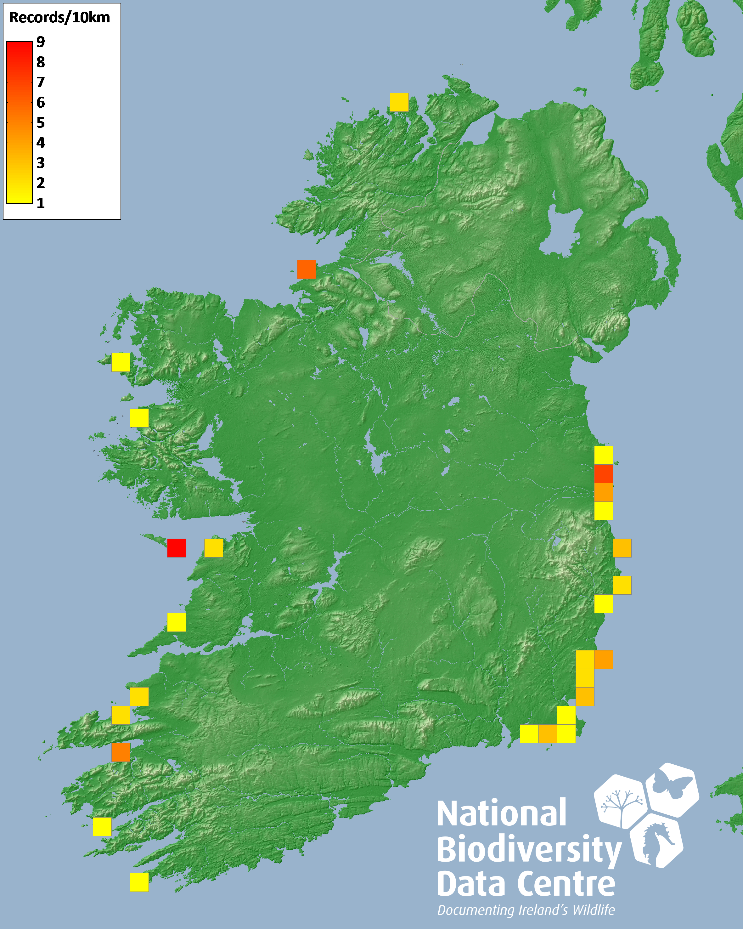 Distribution of the number of records recorded within each 10km grid square (ITM).Marine Map - 50km