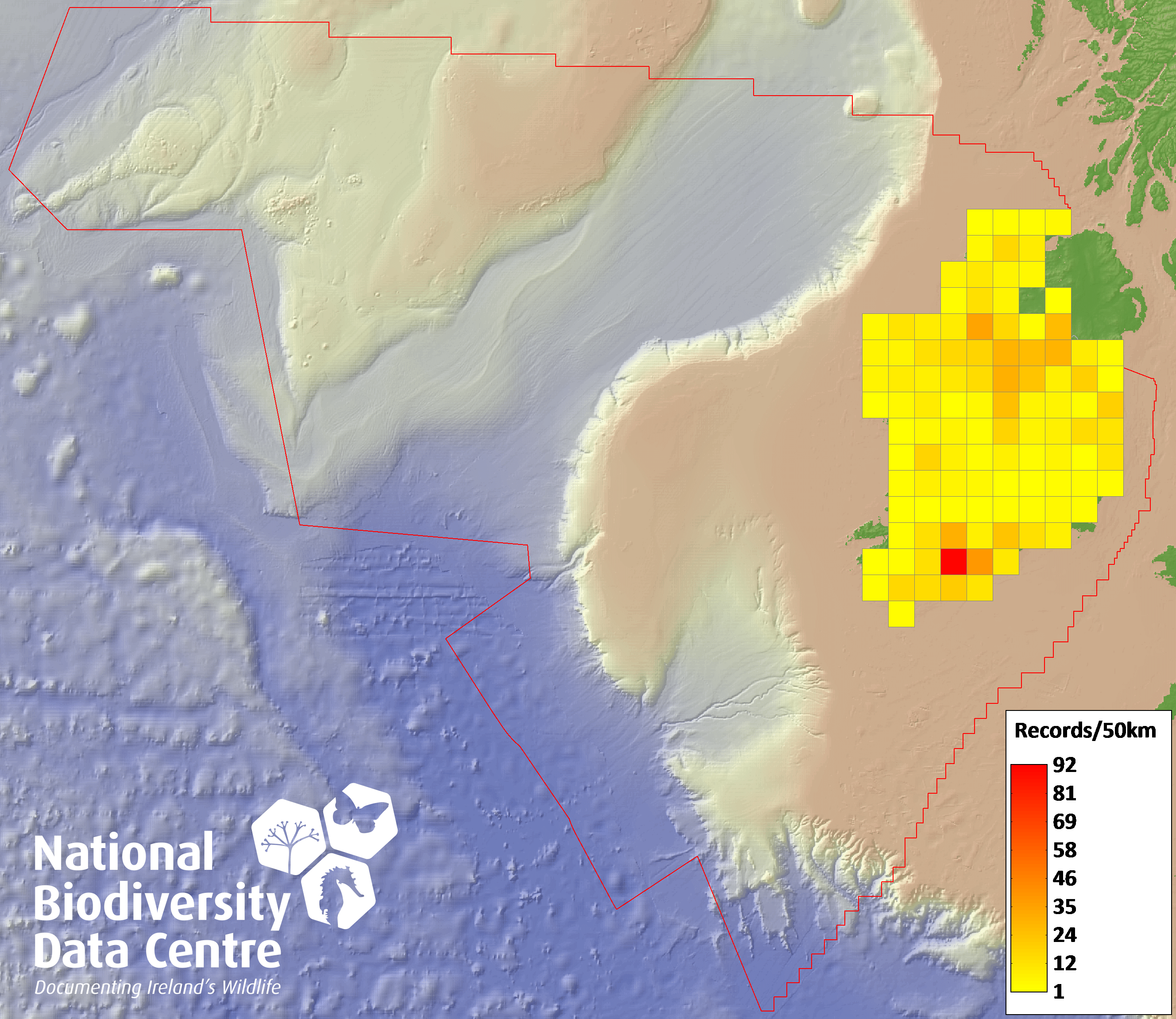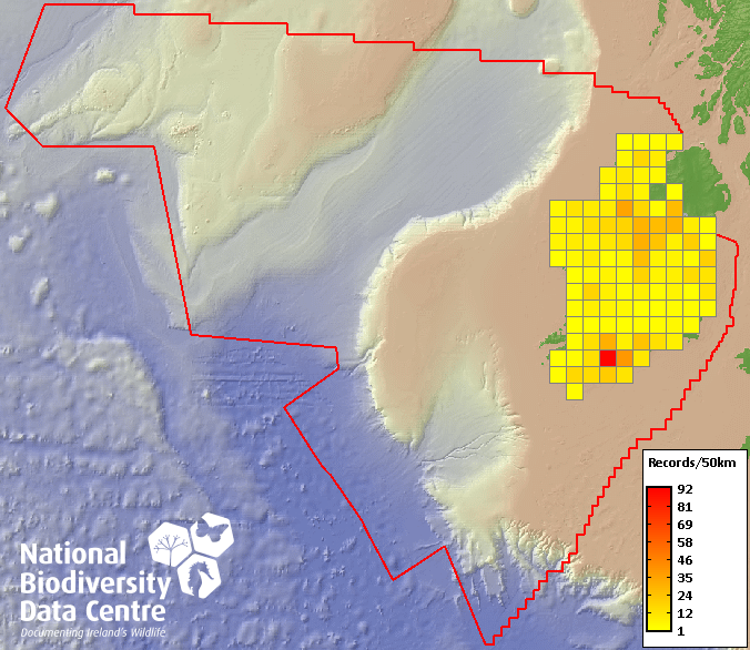 Distribution of the number of records recorded within each 10km grid square (ITM).Marine Map - 50km