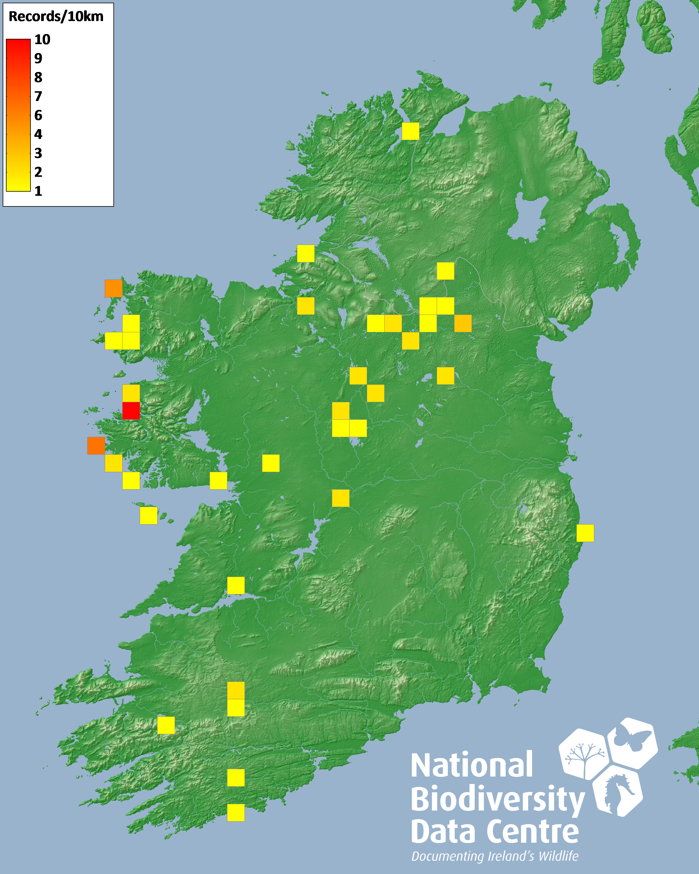 Distribution of the number of records recorded within each 10km grid square (ITM).Marine Map - 50km