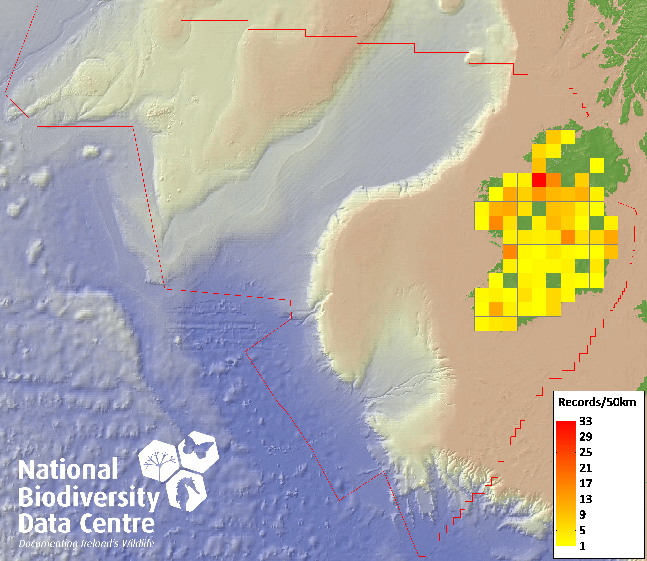 Distribution of the number of records recorded within each 10km grid square (ITM).Marine Map - 50km