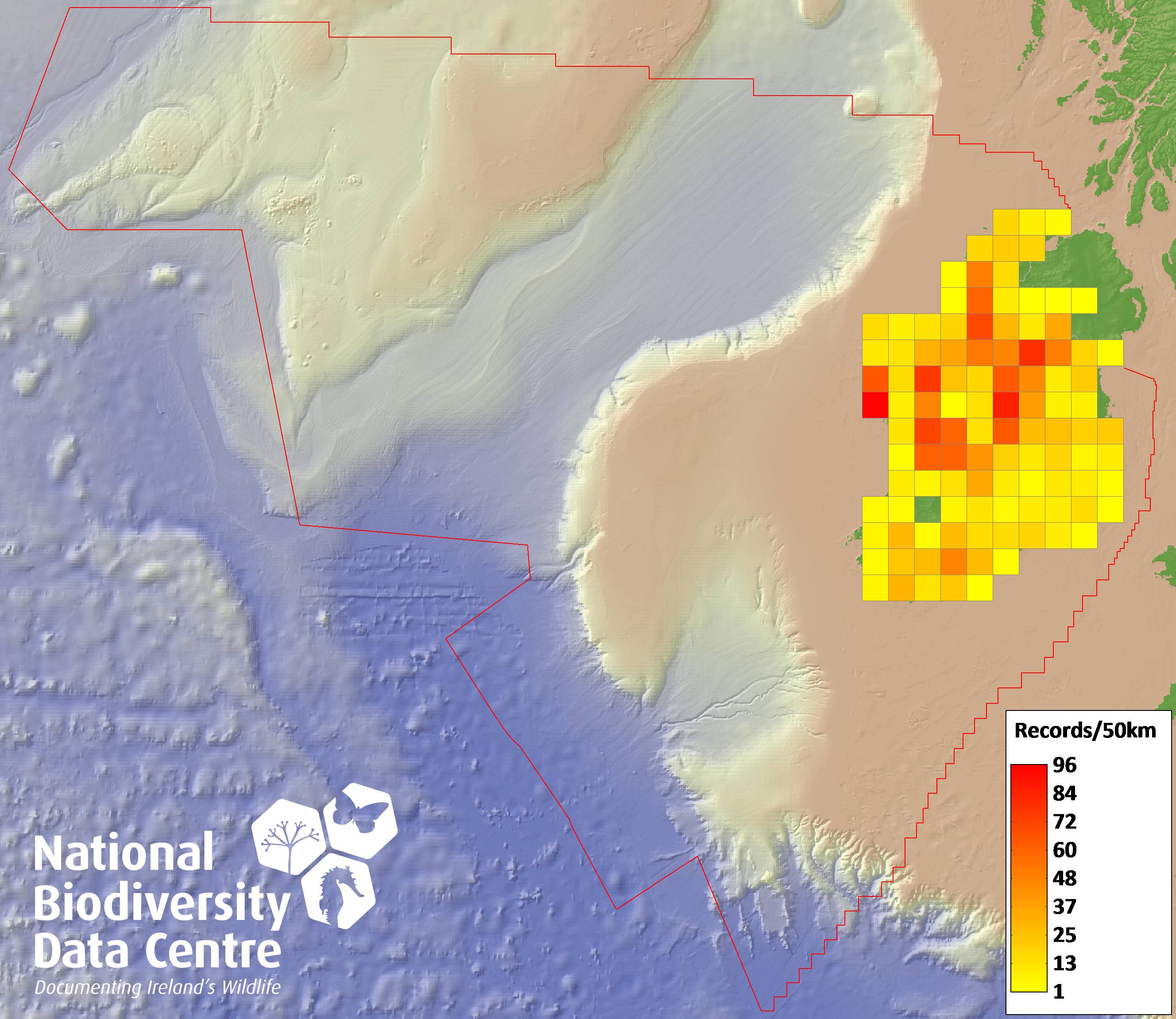 Distribution of the number of records recorded within each 10km grid square (ITM).Marine Map - 50km