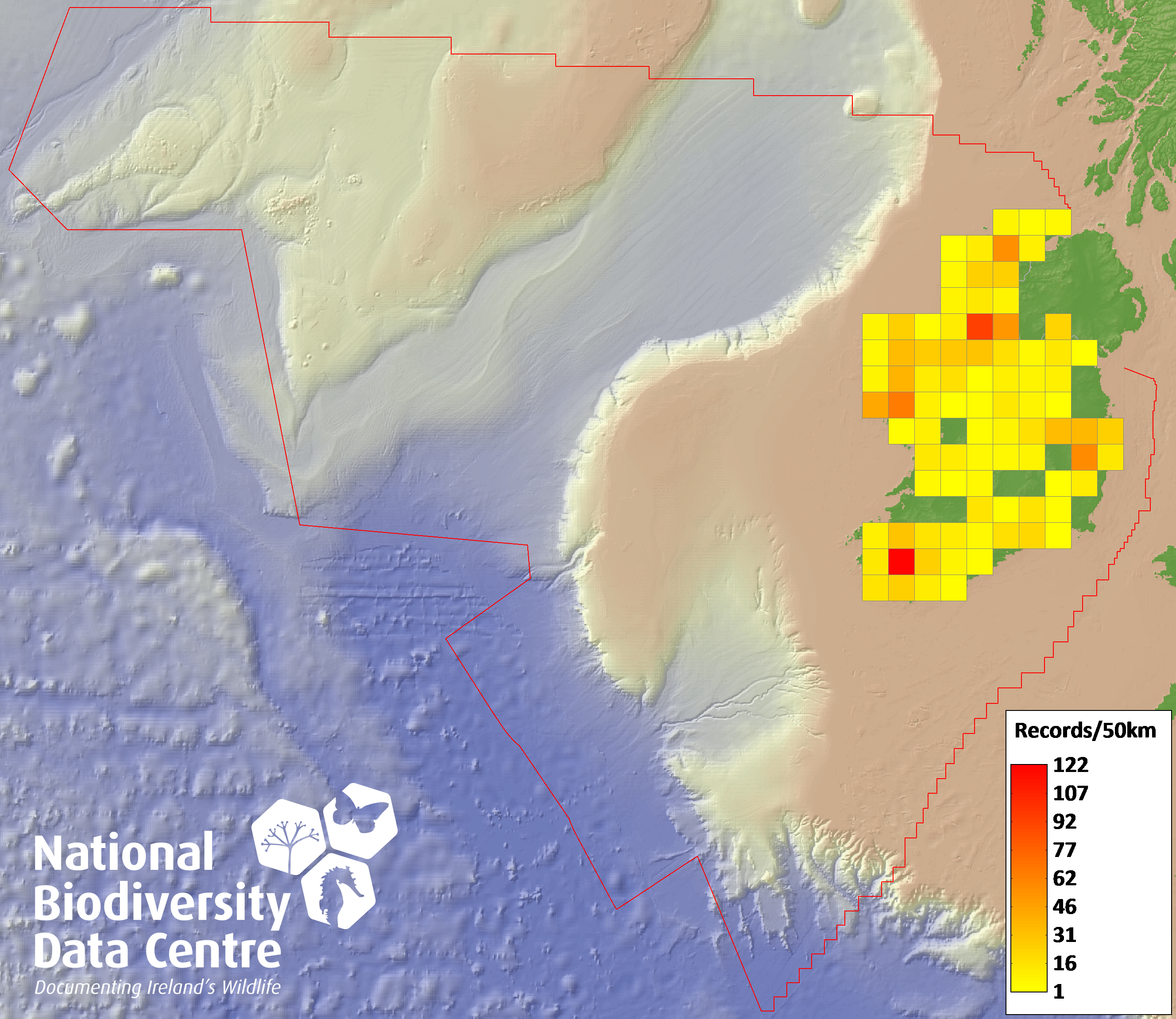 Distribution of the number of records recorded within each 10km grid square (ITM).Marine Map - 50km