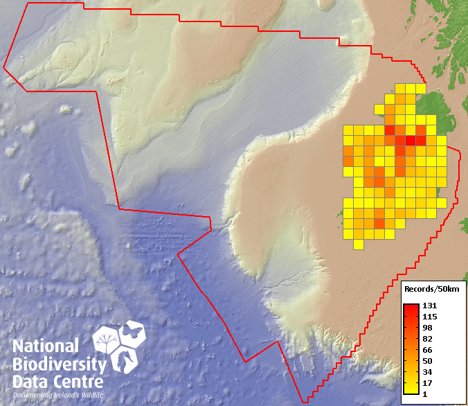 Distribution of the number of records recorded within each 10km grid square (ITM).Marine Map - 50km