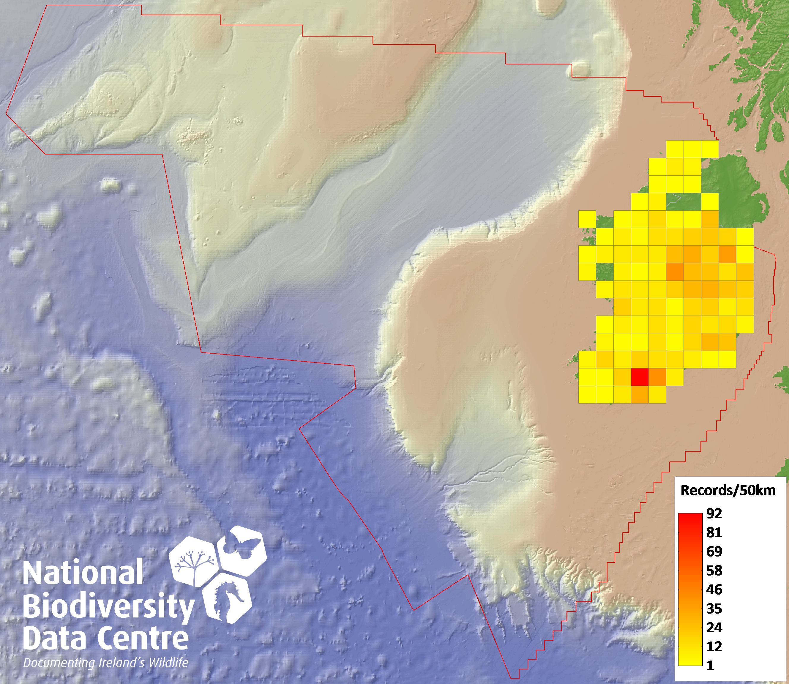 Distribution of the number of records recorded within each 10km grid square (ITM).Marine Map - 50km