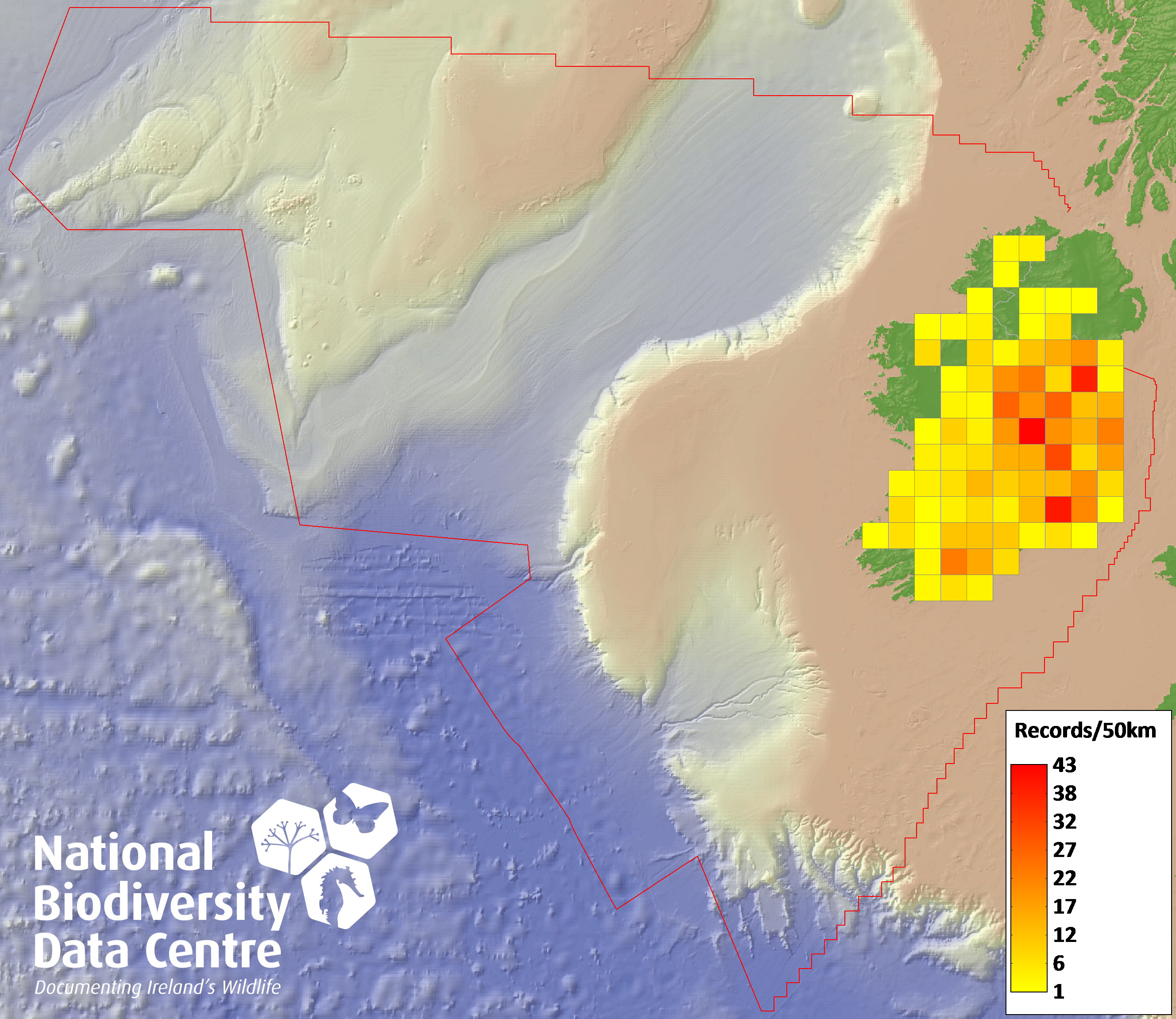 Distribution of the number of records recorded within each 10km grid square (ITM).Marine Map - 50km