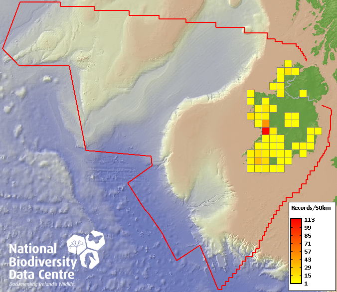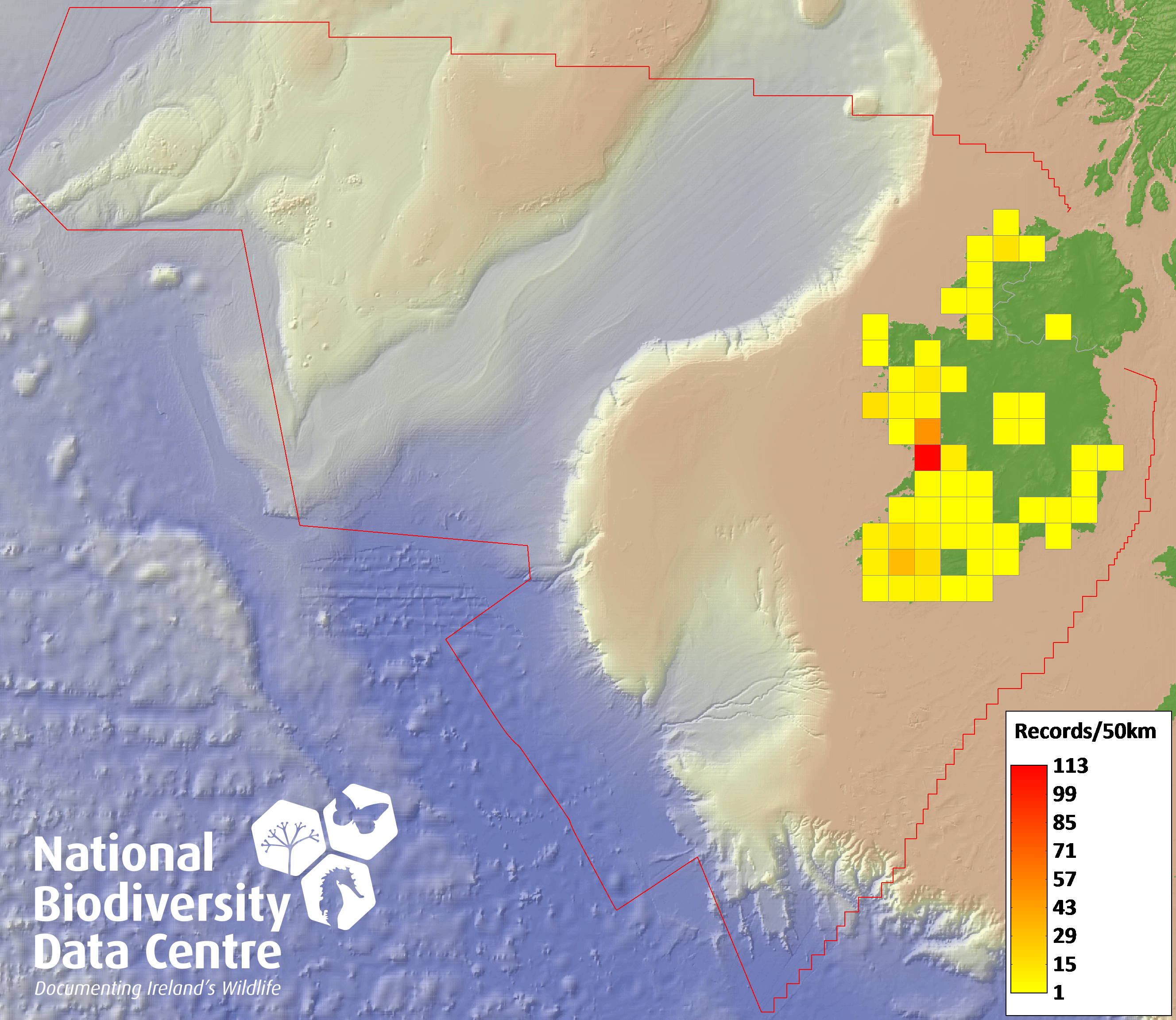Distribution of the number of records recorded within each 10km grid square (ITM).Marine Map - 50km