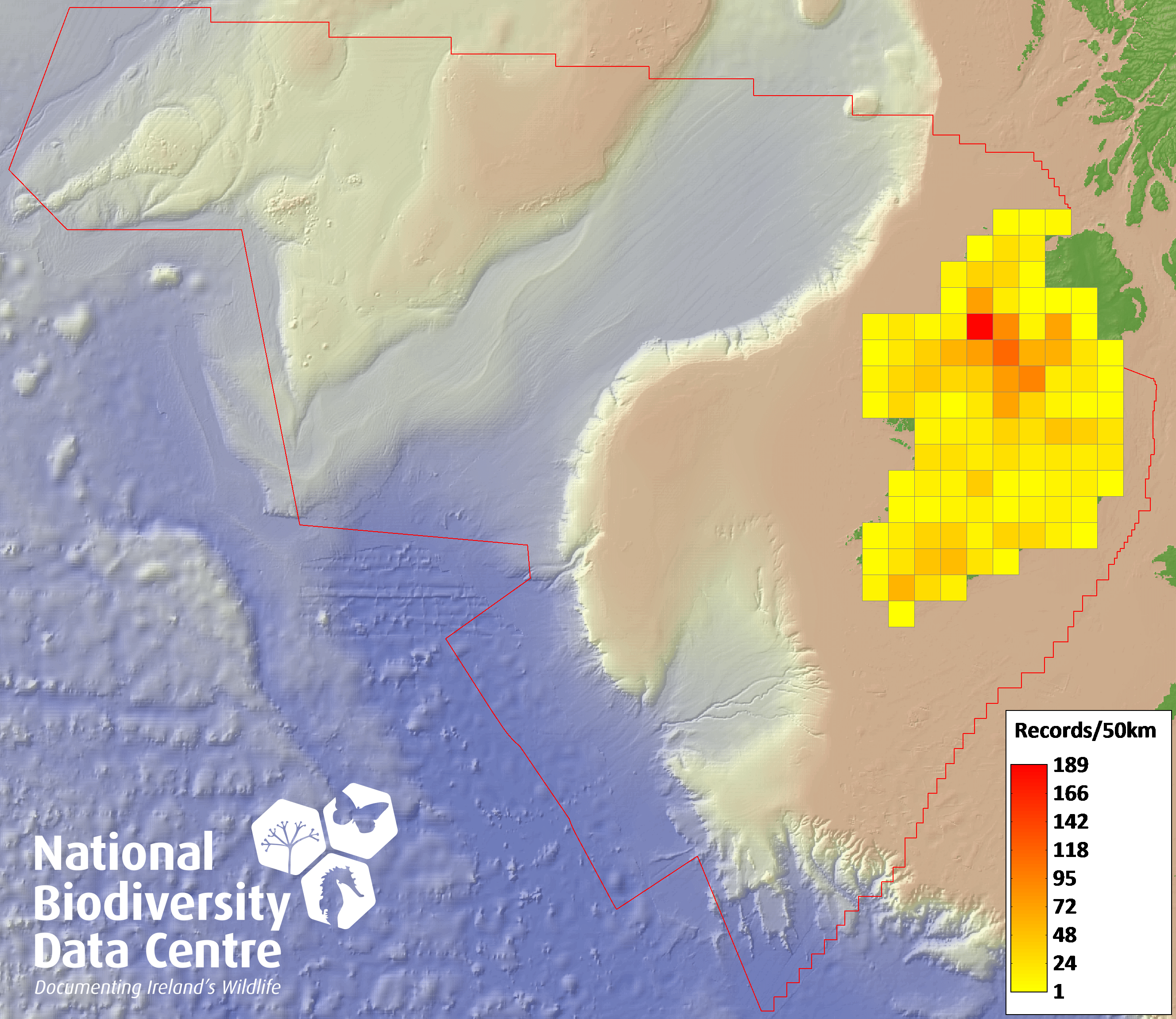 Distribution of the number of records recorded within each 10km grid square (ITM).Marine Map - 50km