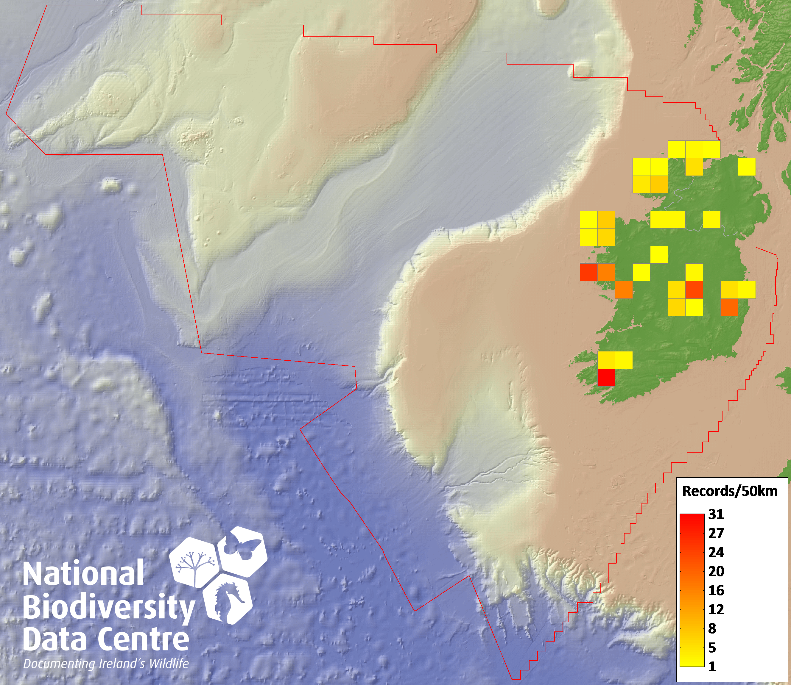 Distribution of the number of records recorded within each 10km grid square (ITM).Marine Map - 50km