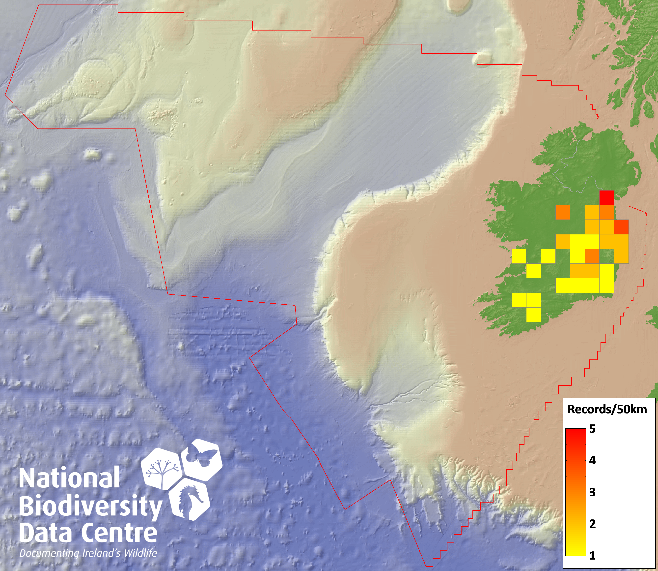 Distribution of the number of records recorded within each 10km grid square (ITM).Marine Map - 50km