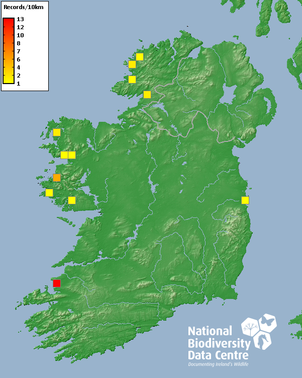 Distribution of the number of records recorded within each 10km grid square (ITM).Marine Map - 50km