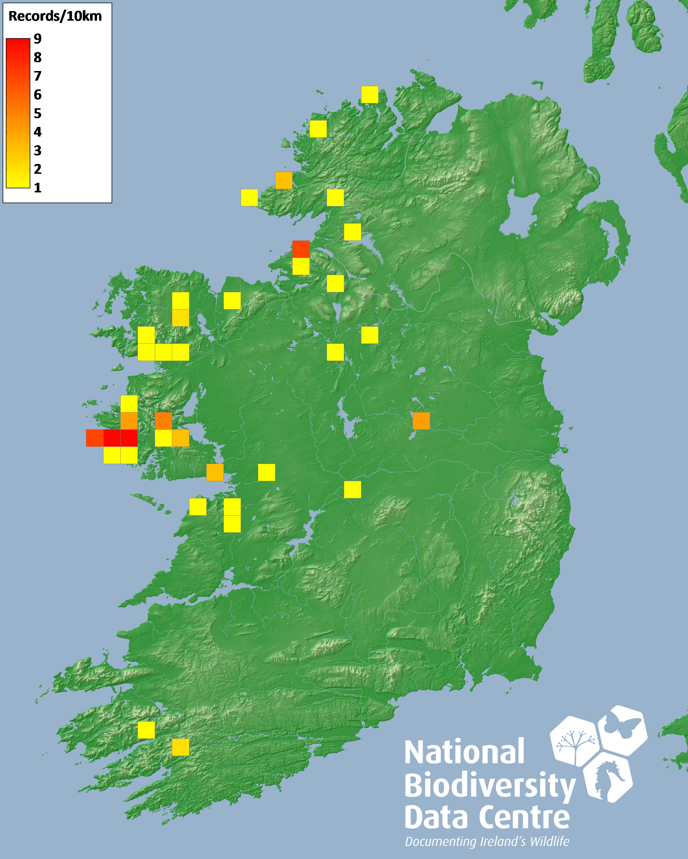 Distribution of the number of records recorded within each 10km grid square (ITM).Marine Map - 50km
