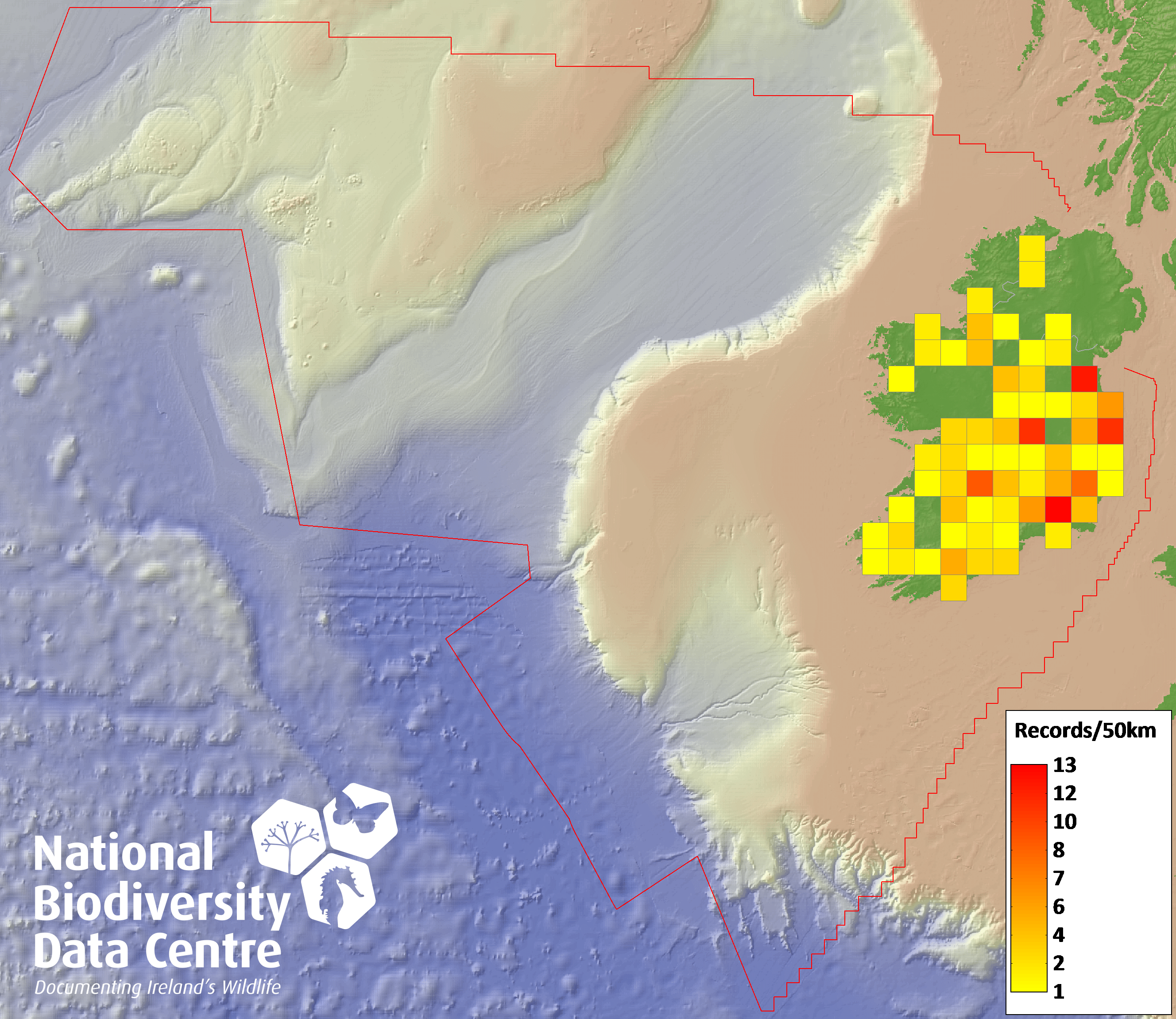 Distribution of the number of records recorded within each 10km grid square (ITM).Marine Map - 50km