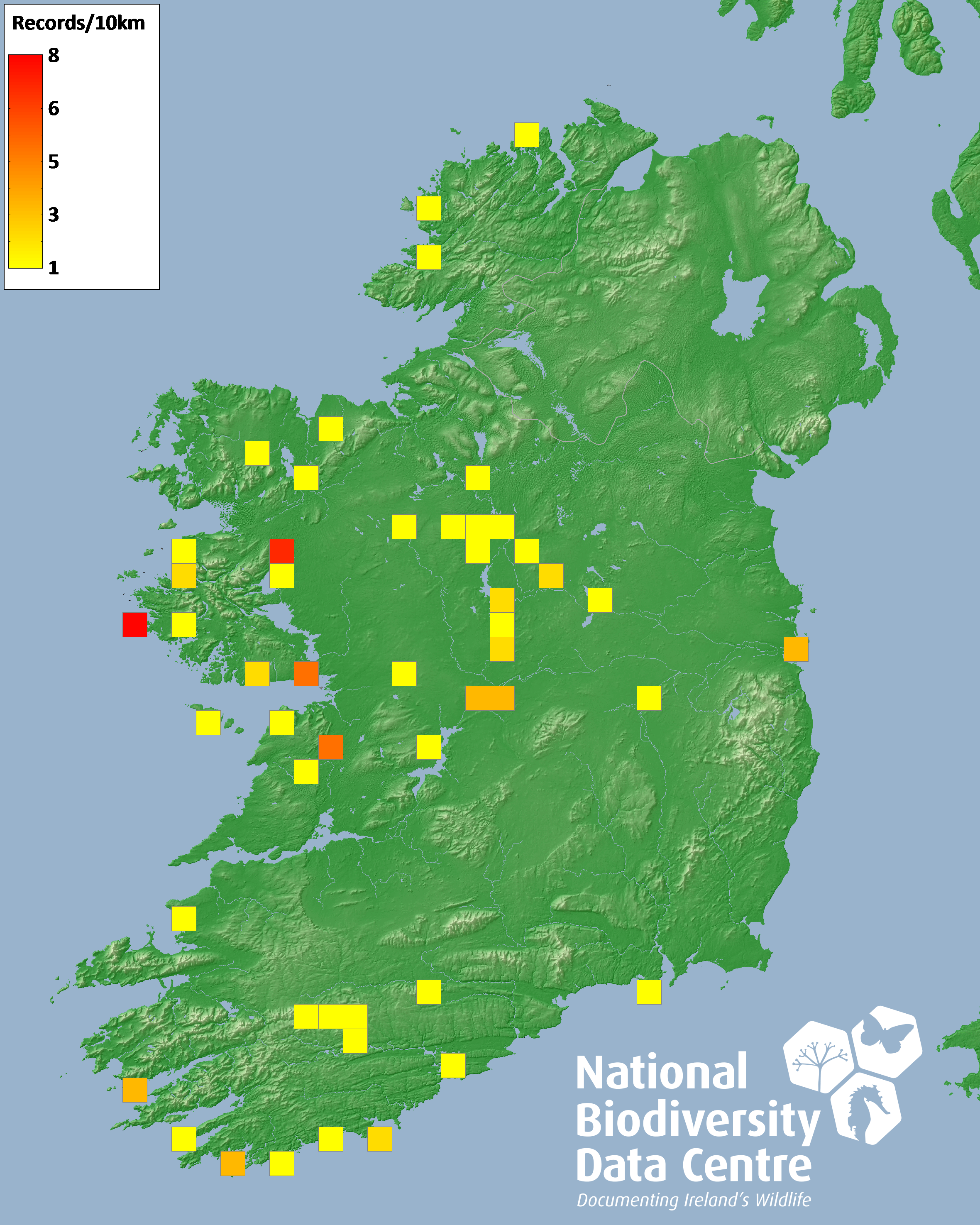 Distribution of the number of records recorded within each 10km grid square (ITM).Marine Map - 50km