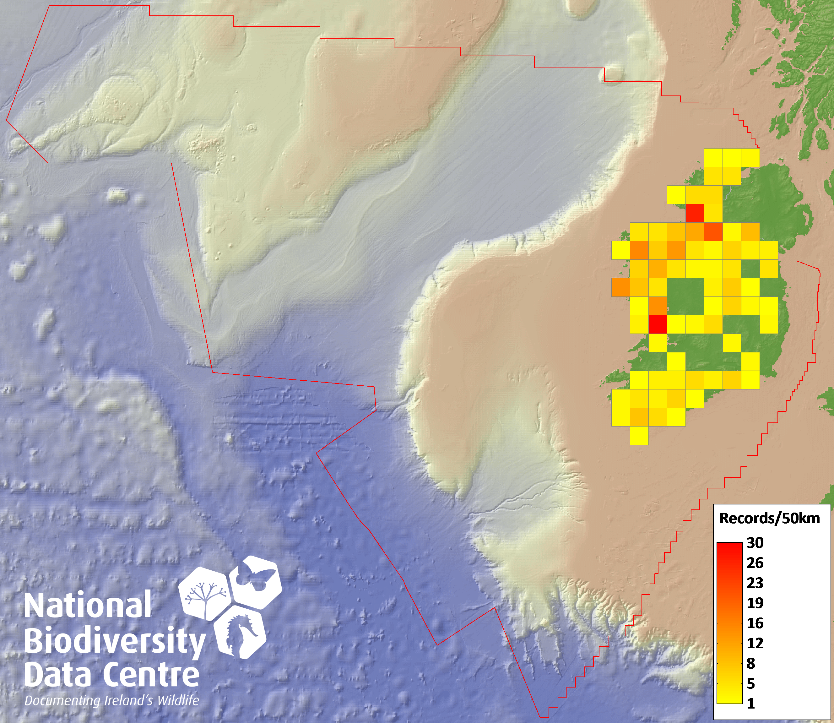 Distribution of the number of records recorded within each 10km grid square (ITM).Marine Map - 50km