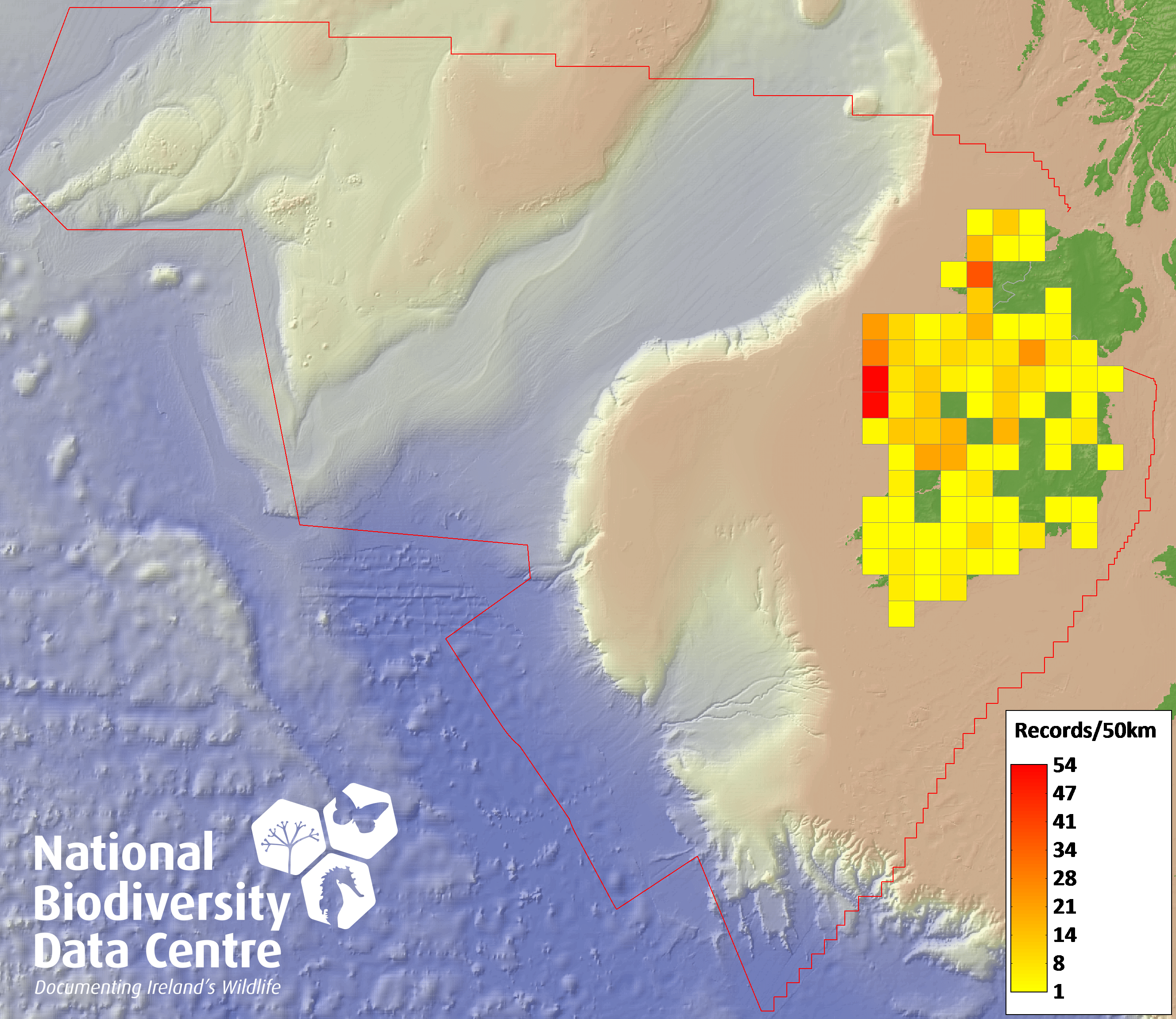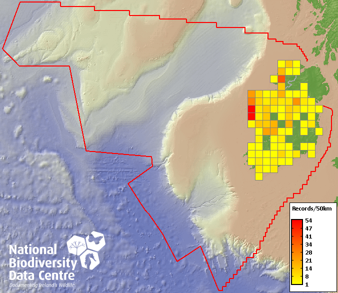 Distribution of the number of records recorded within each 10km grid square (ITM).Marine Map - 50km